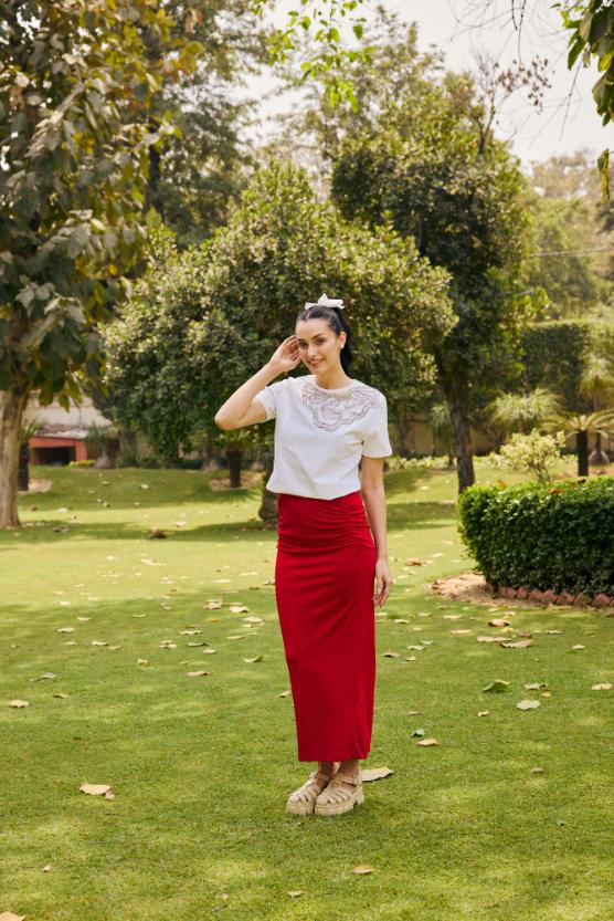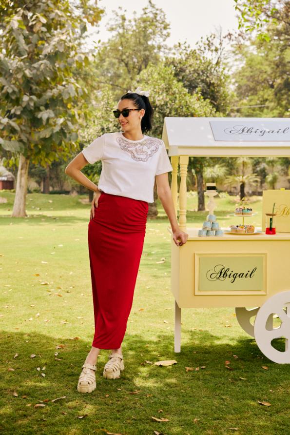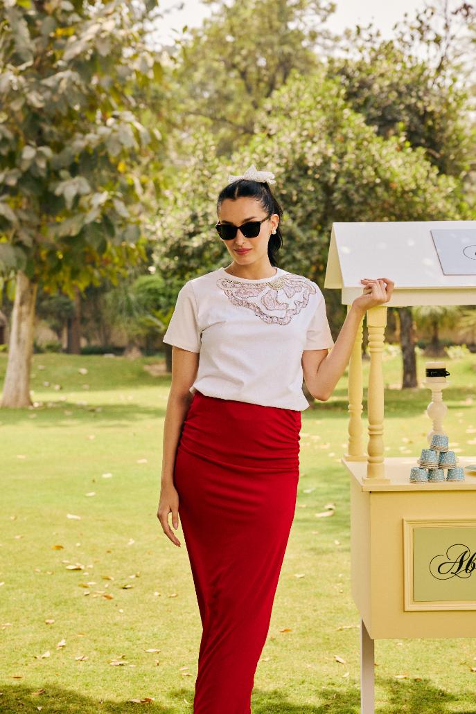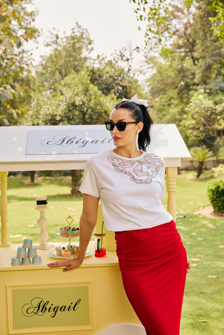Organic cotton t-shirt, hand embroidered with Swarovskis & sequins. It is detailed with Chantelle lace.