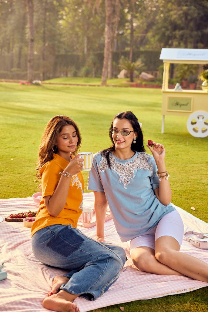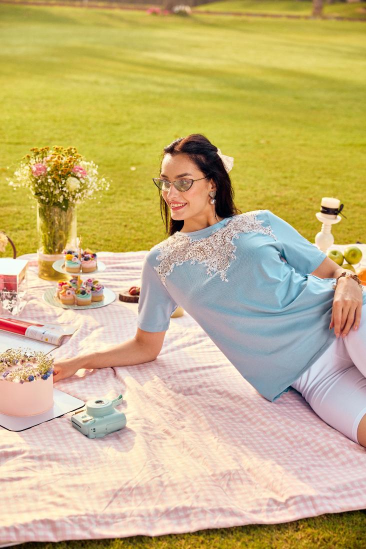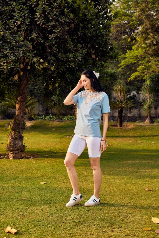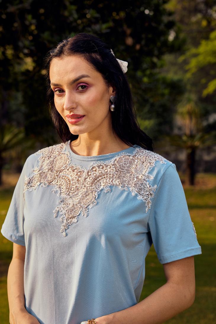 Organic cotton t-shirt, hand embroidered with Swarovskis & sequins. The neck is detailed with lace patchwork