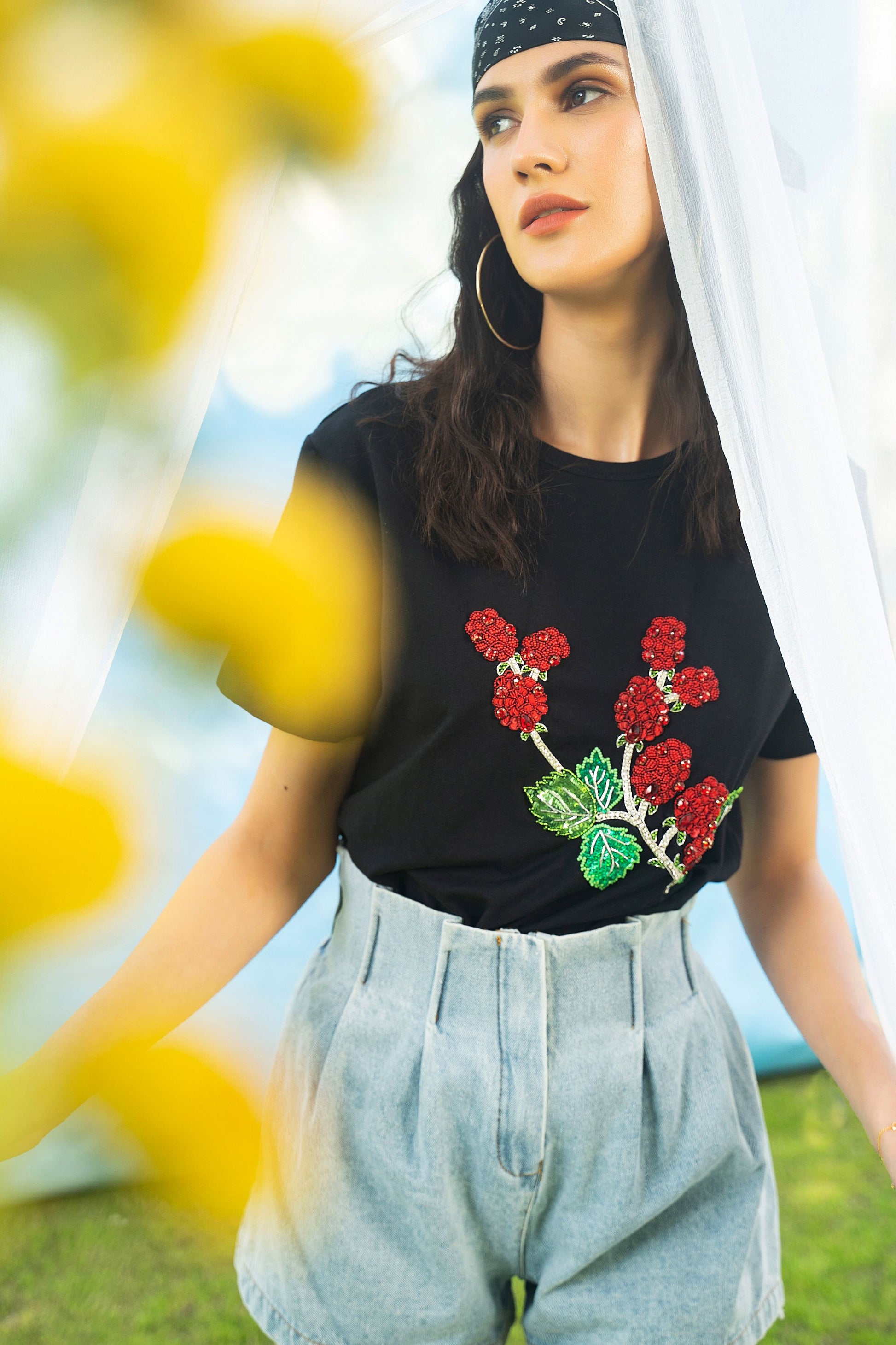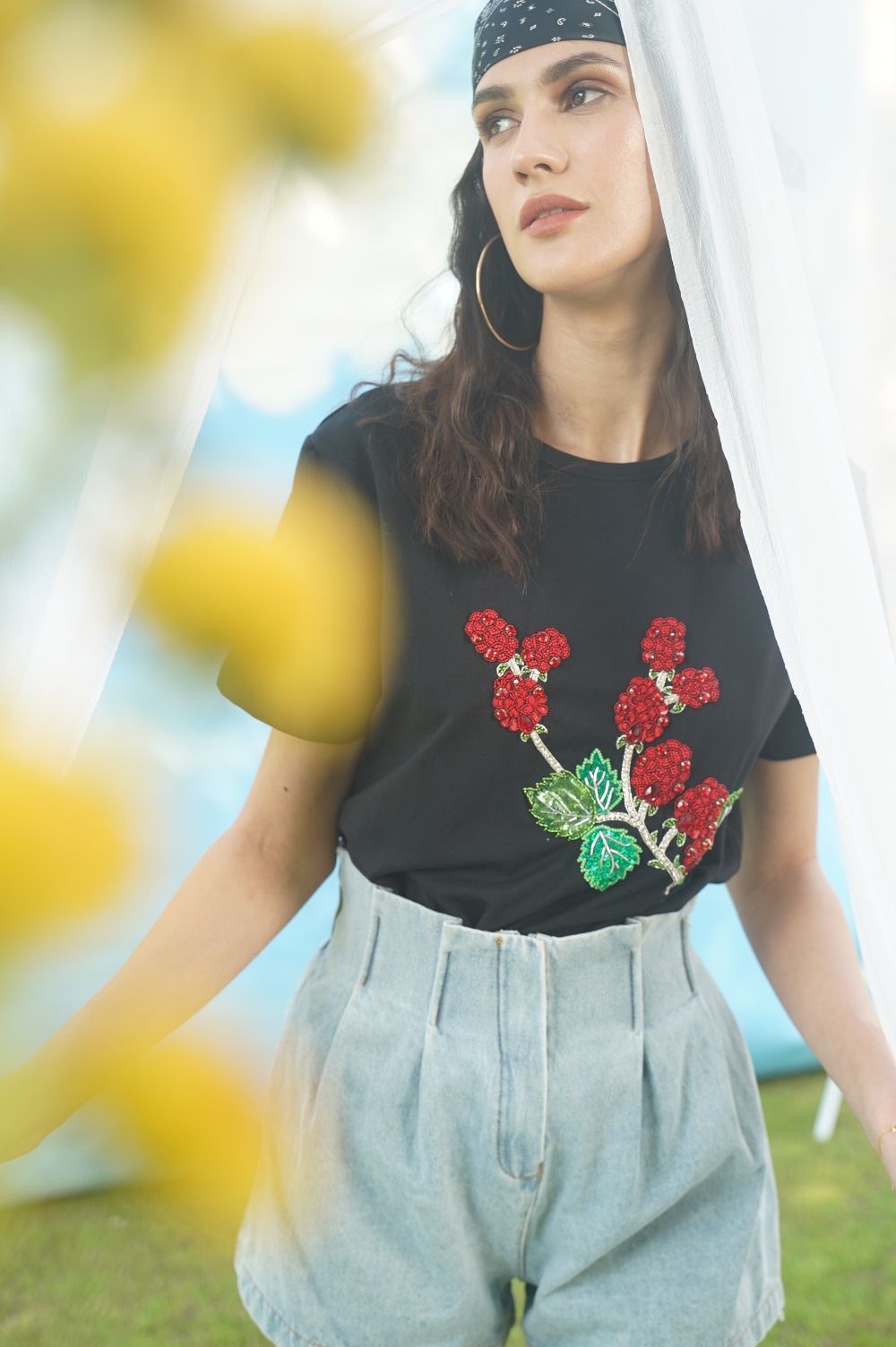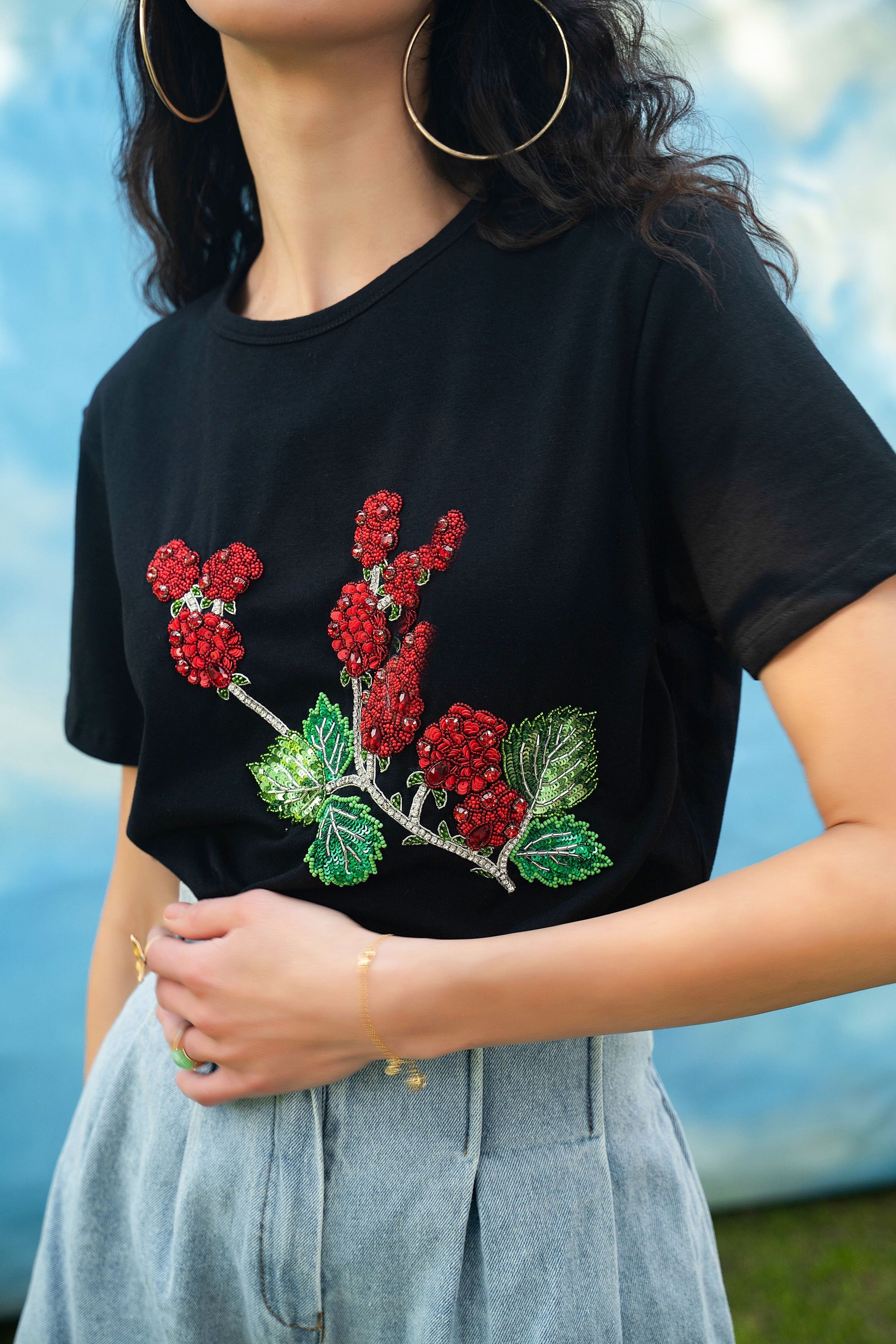BOYFRIEND FIT ORGANIC COTTON T- SHIRT, HAND EMBROIDERED WITH SEQUINS AND SWAROVSKI.