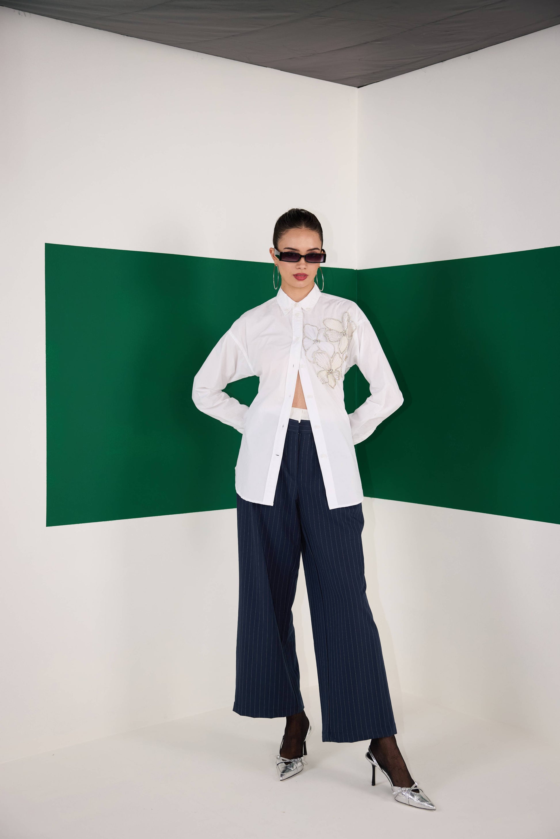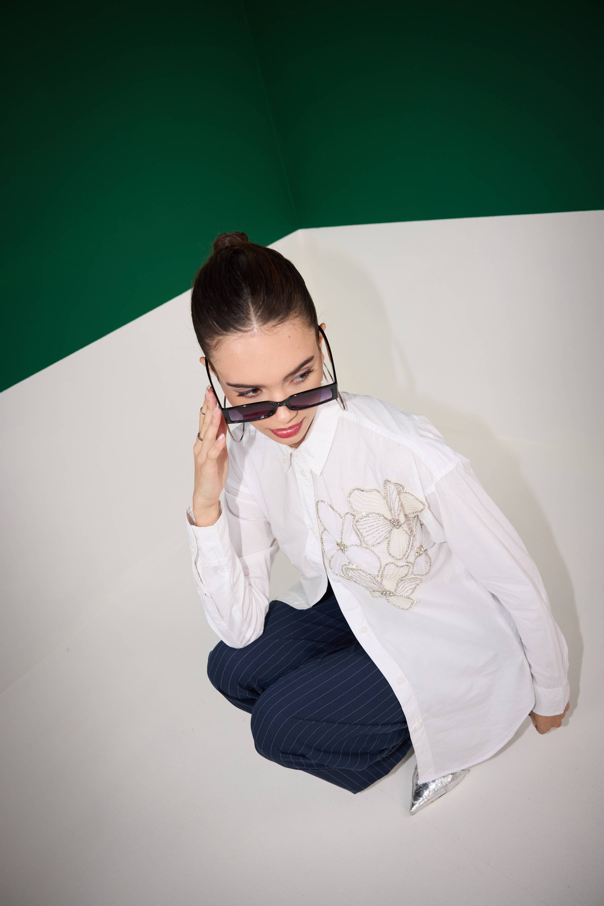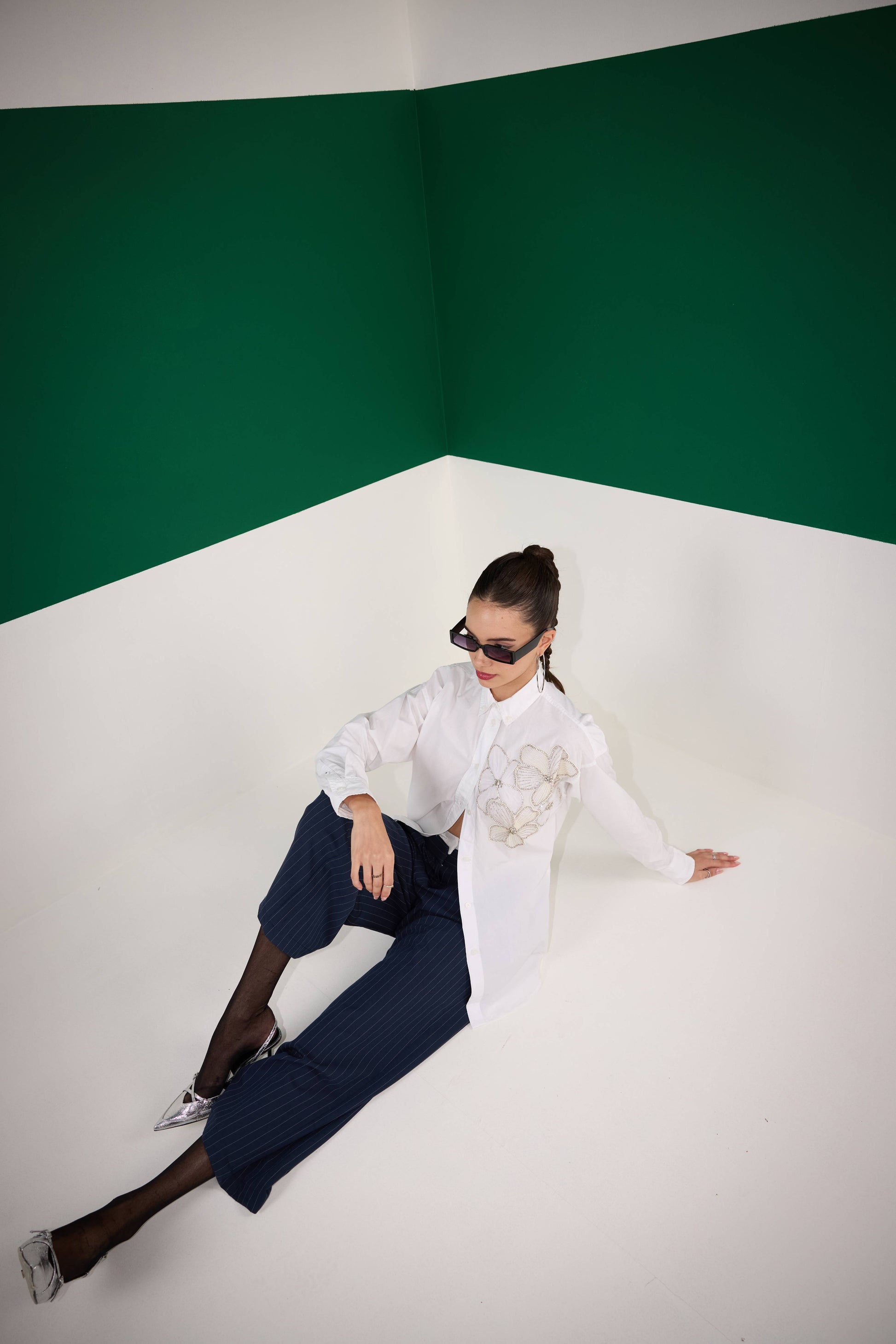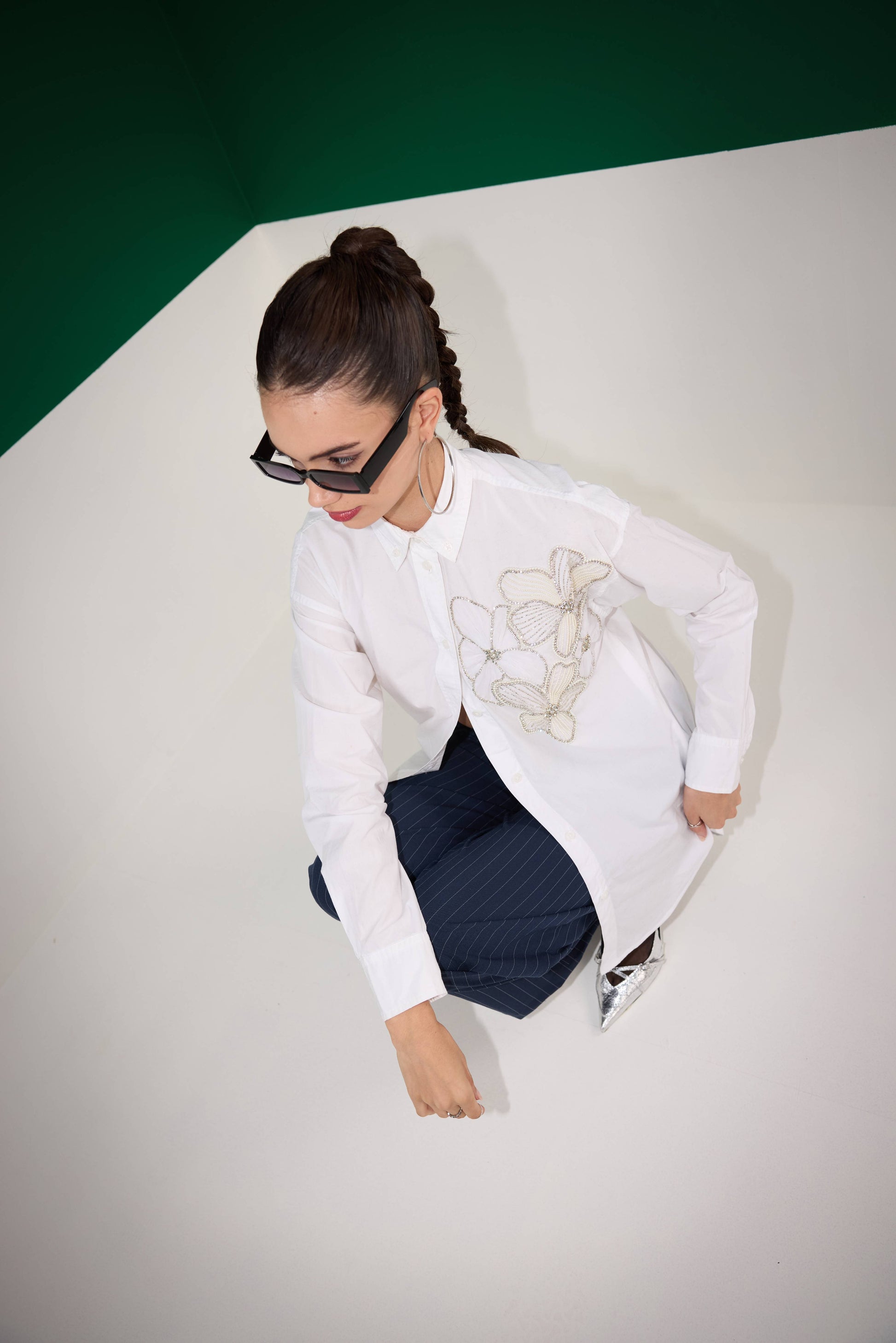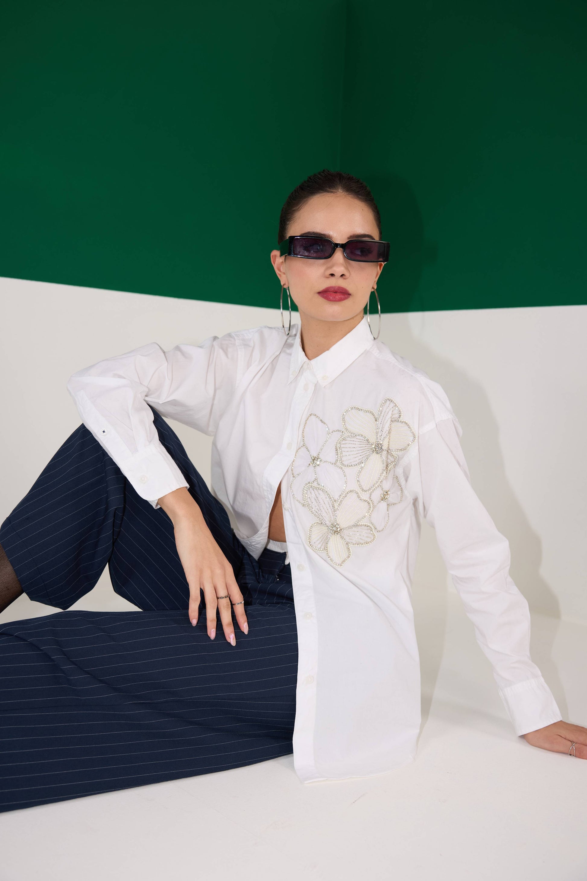 Shirt hand embroidered with Swarovski & Stones making a beautiful flower pattern