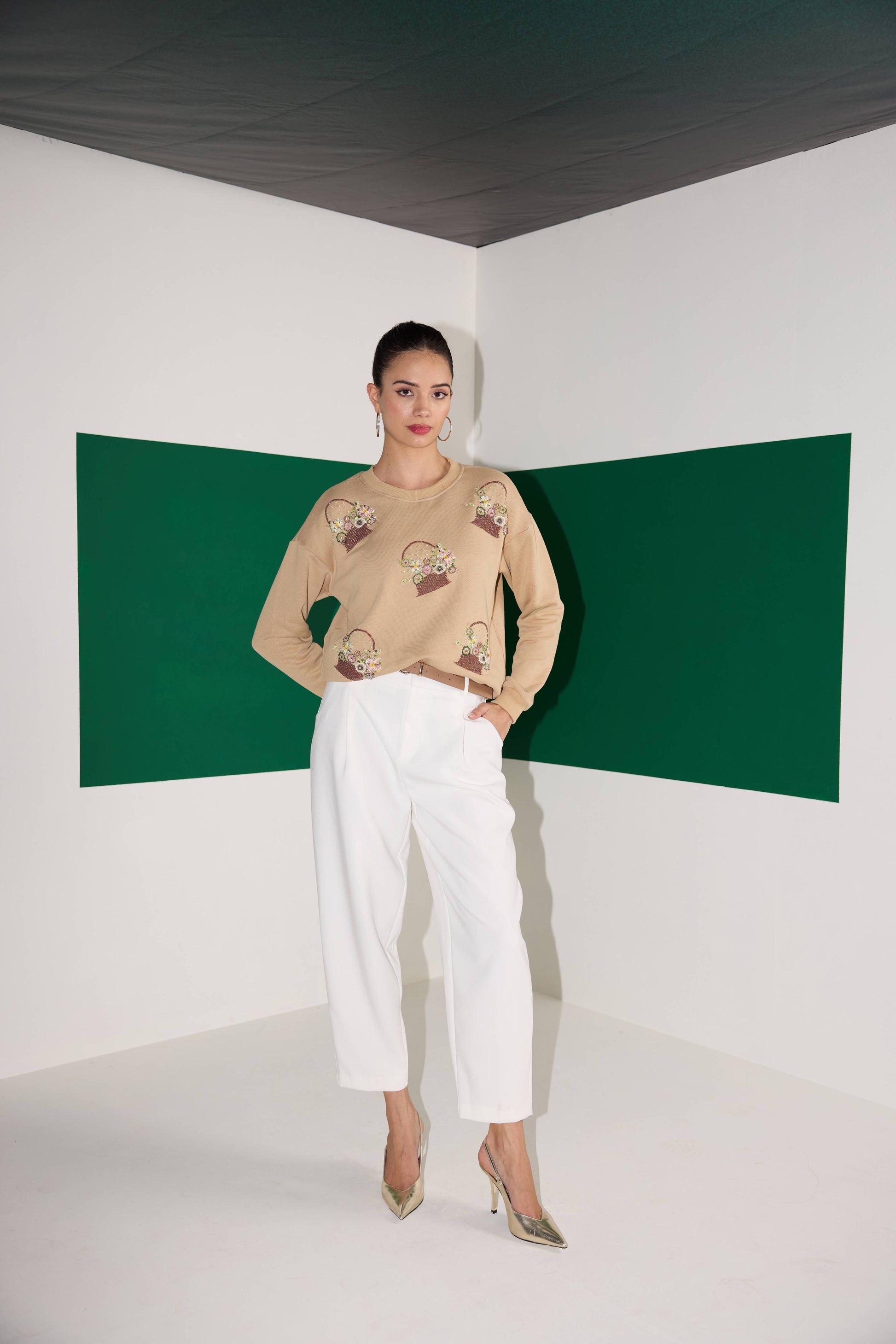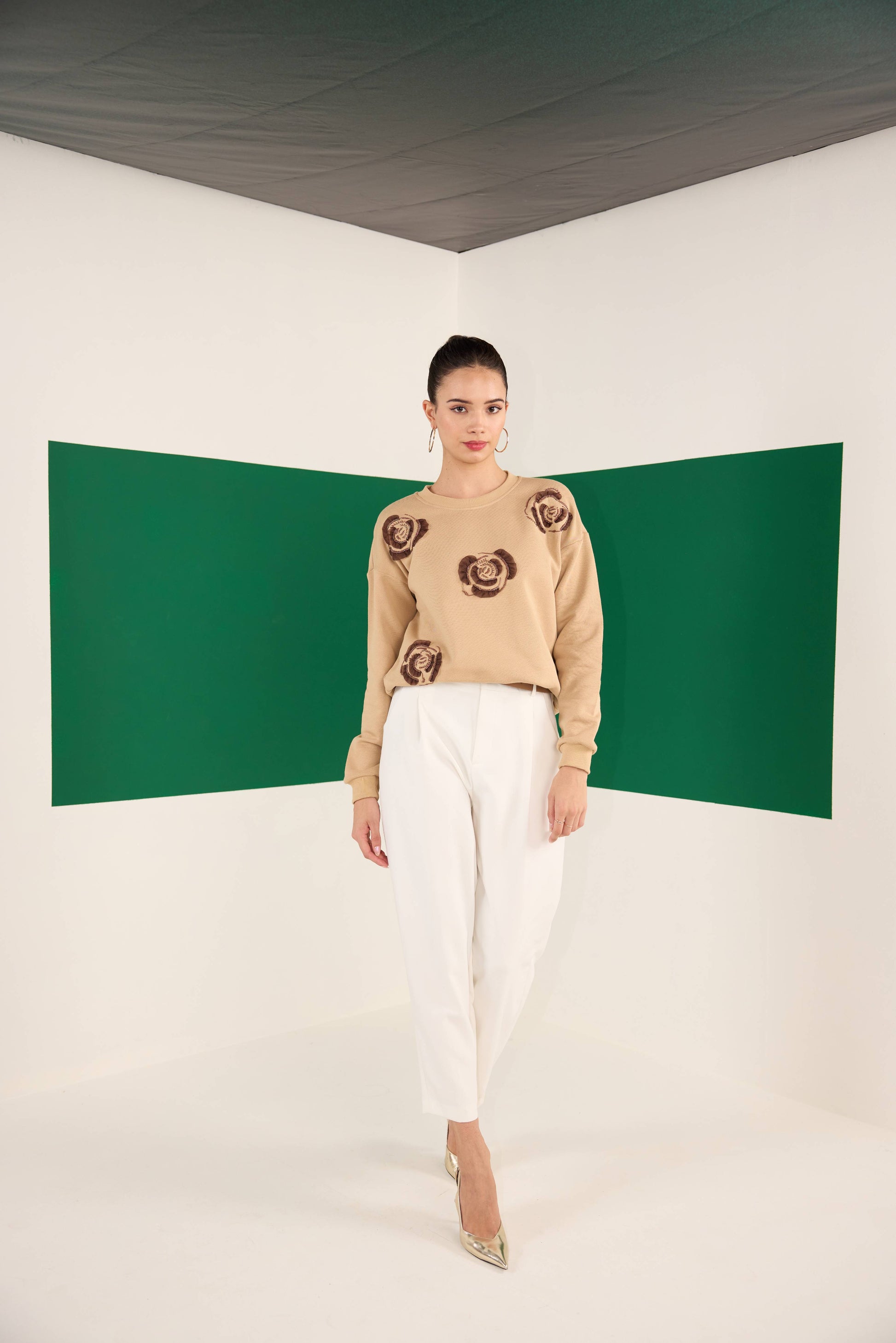 Fleece Sweatshirt hand embroidered with Swarovski & Stones and organza to make floral ruffles making a beautiful flower motifs all over the sweatshirt.