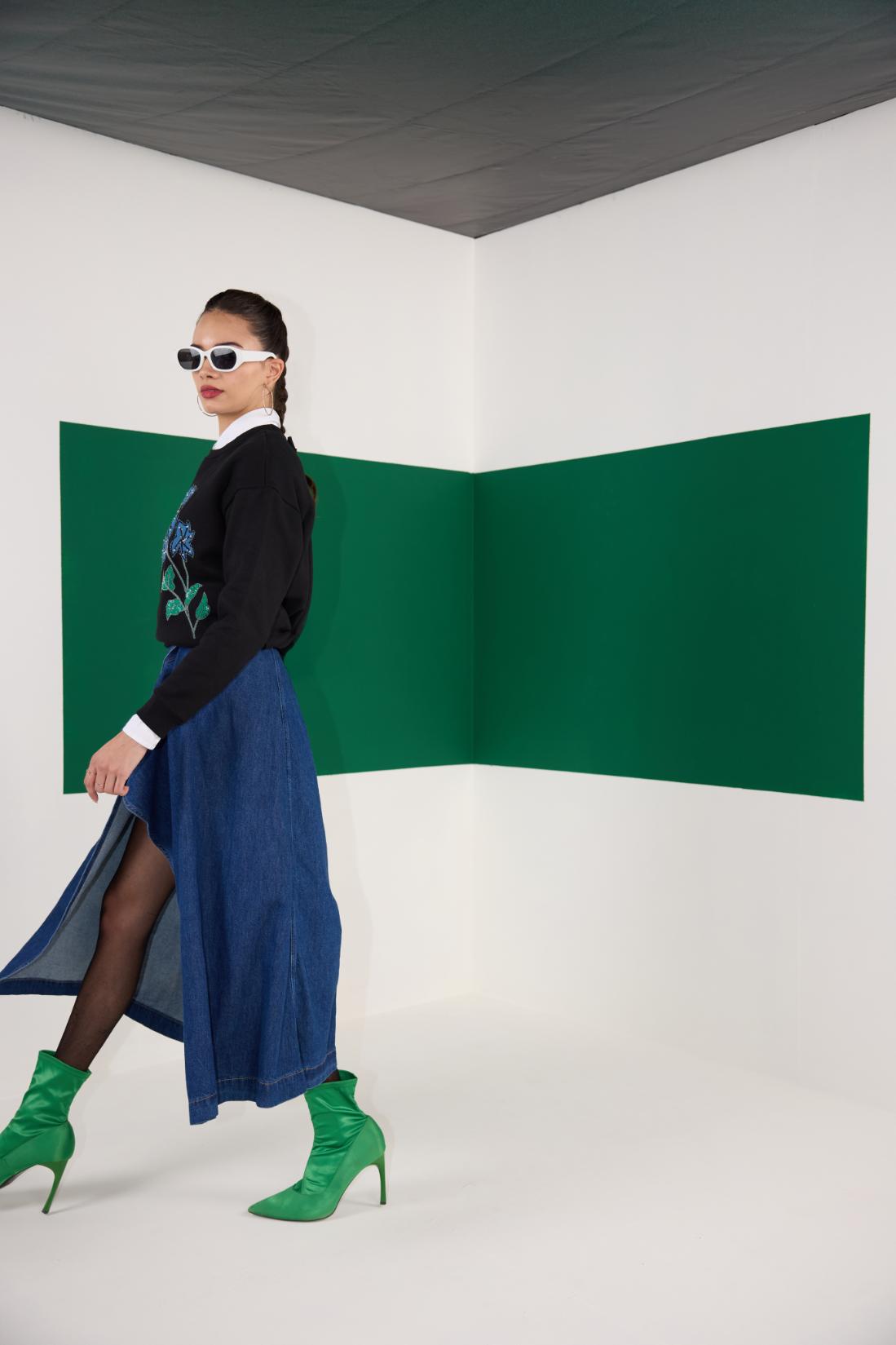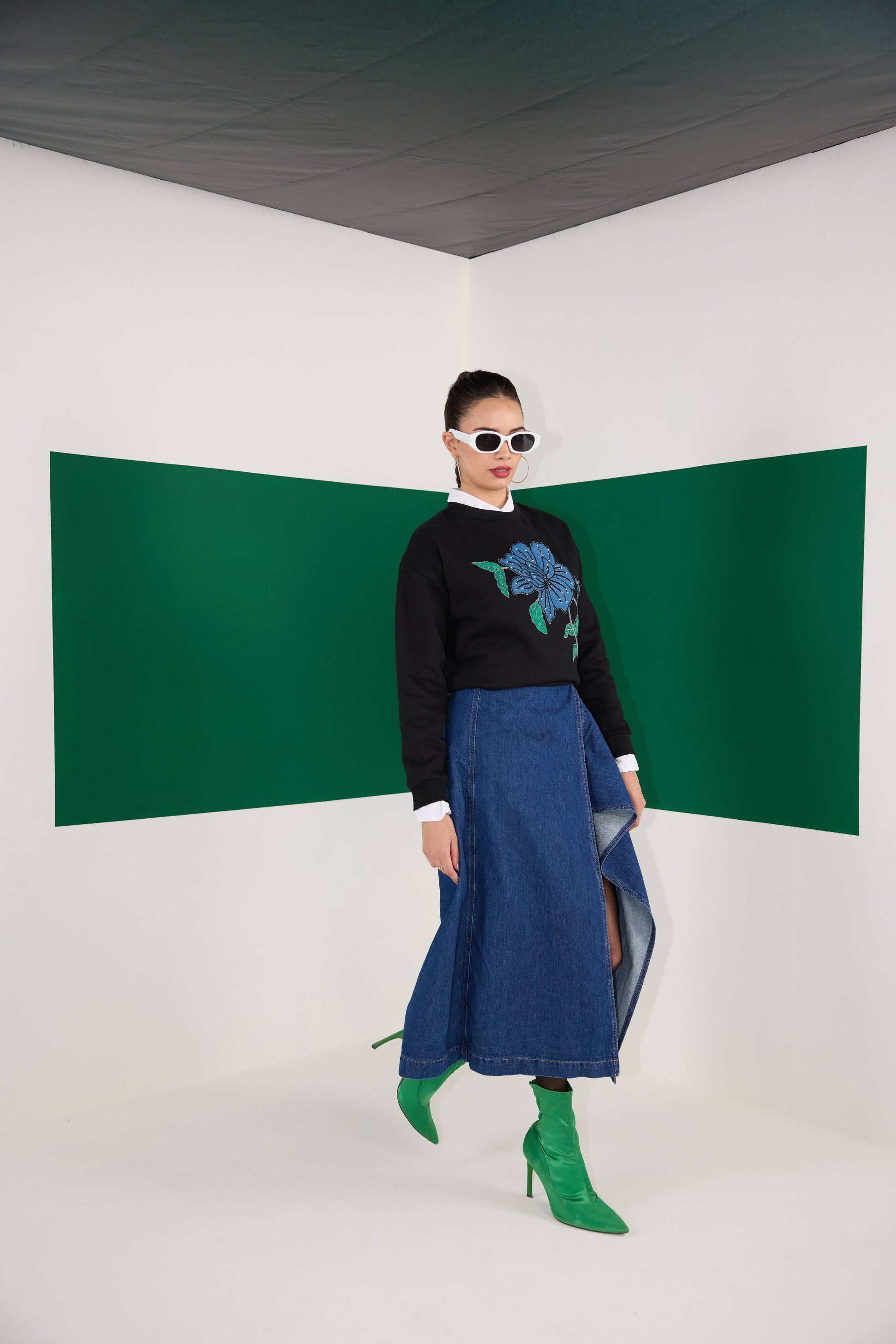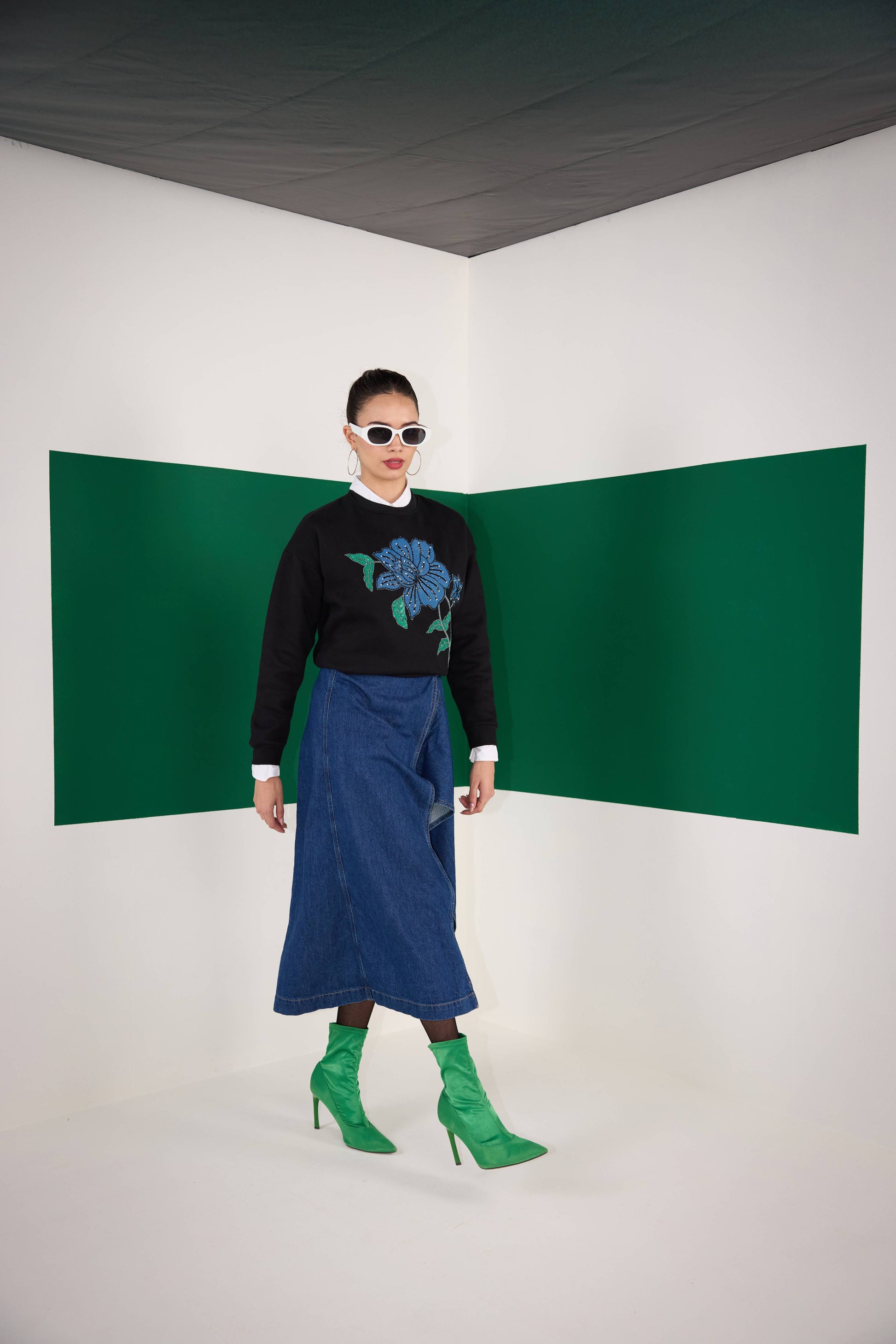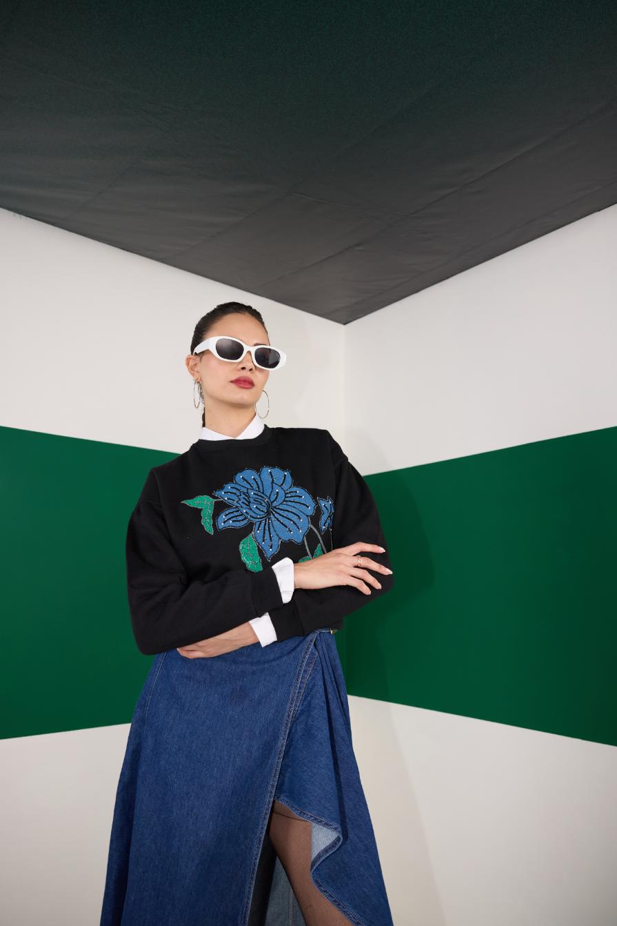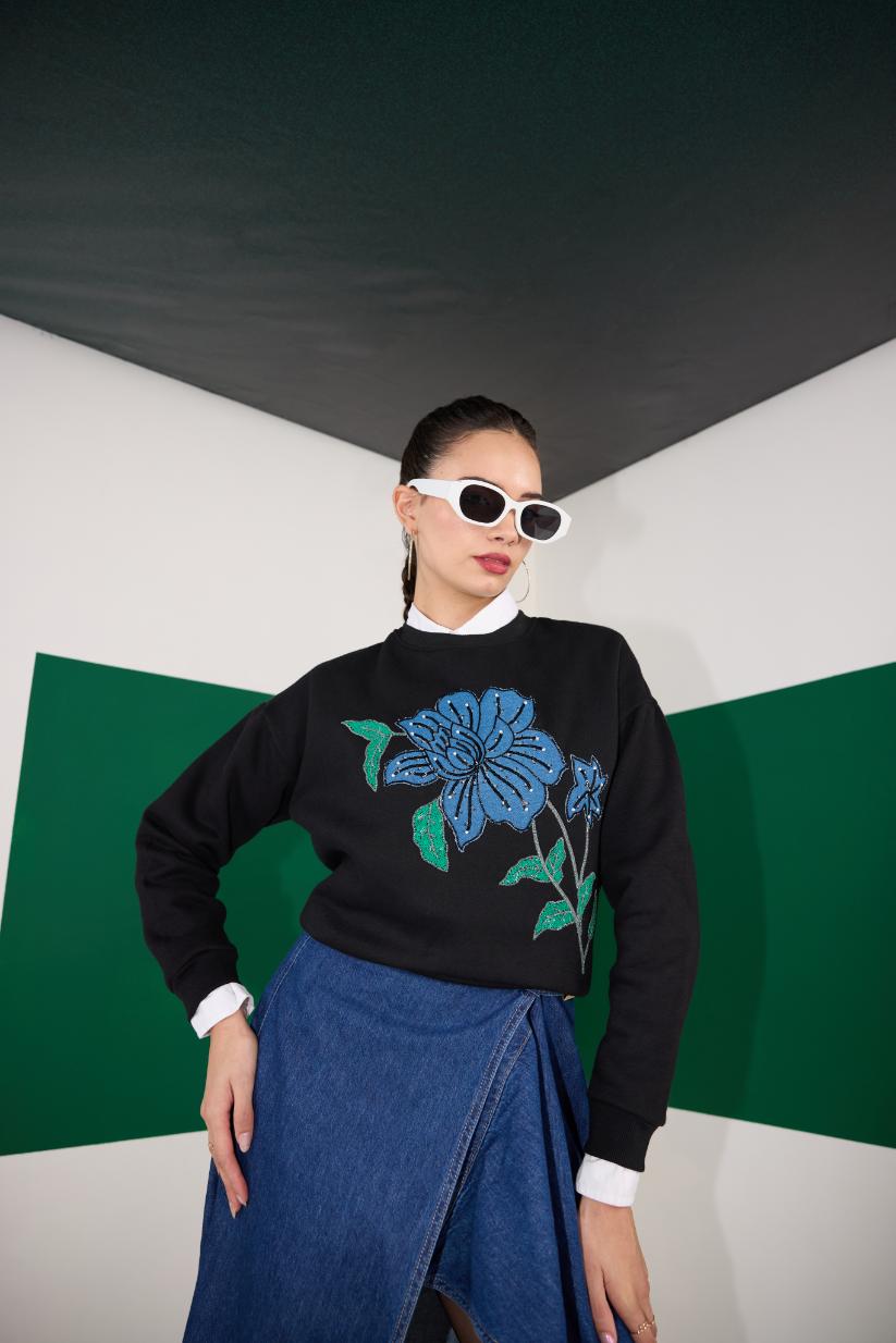 Fleece Sweatshirt hand embroidered with Swarovski & Stones making blue denim flower motif on the sweatshirt.