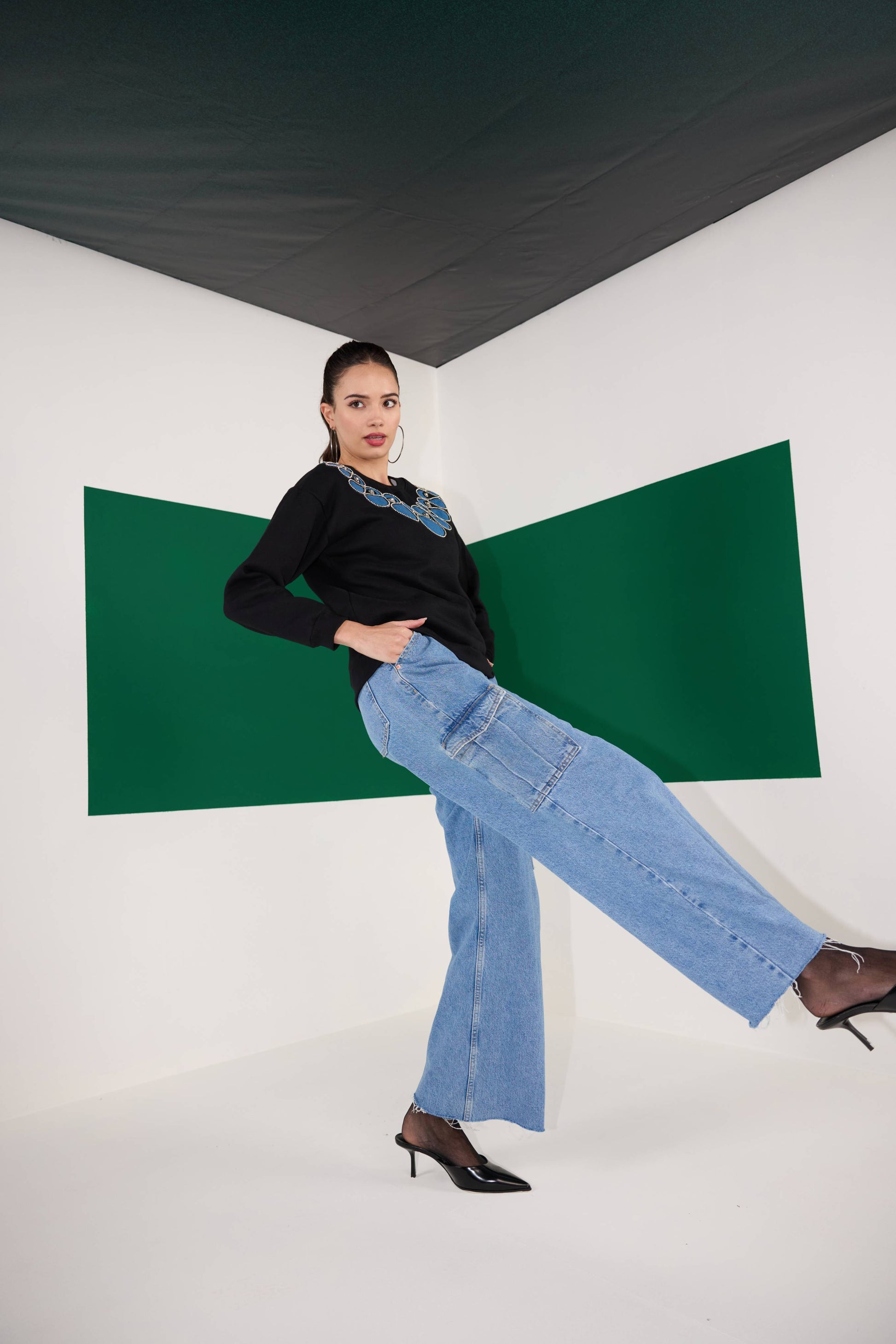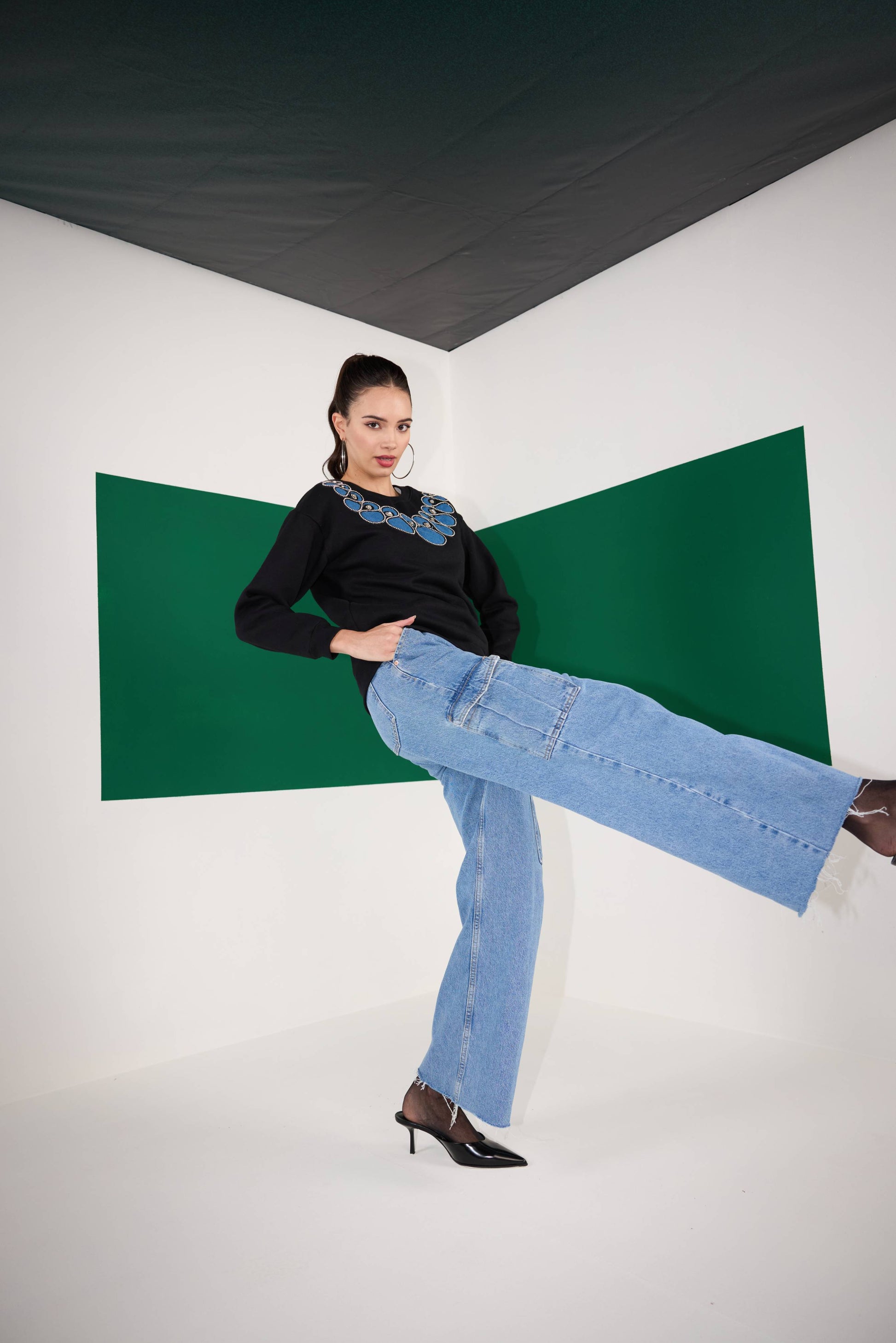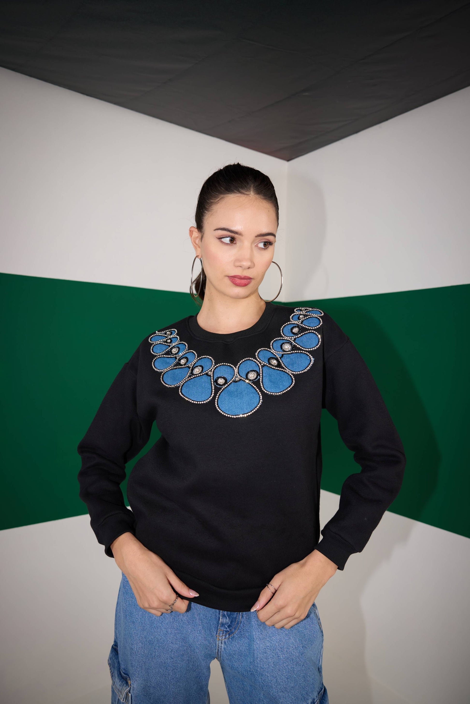 Fleece Sweatshirt hand embroidered with Swarovski & Stones making blue denim flower motif on the sweatshirt.