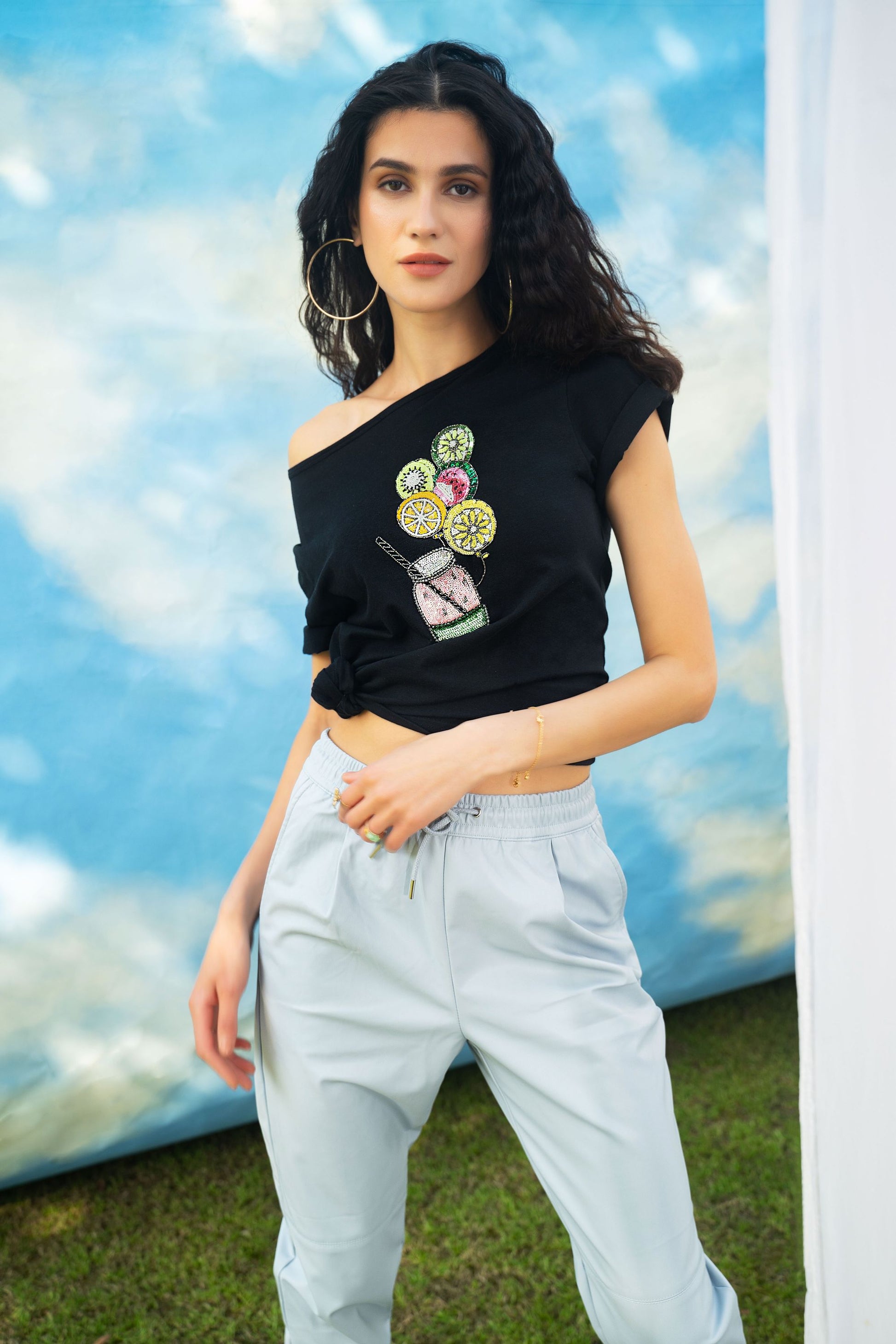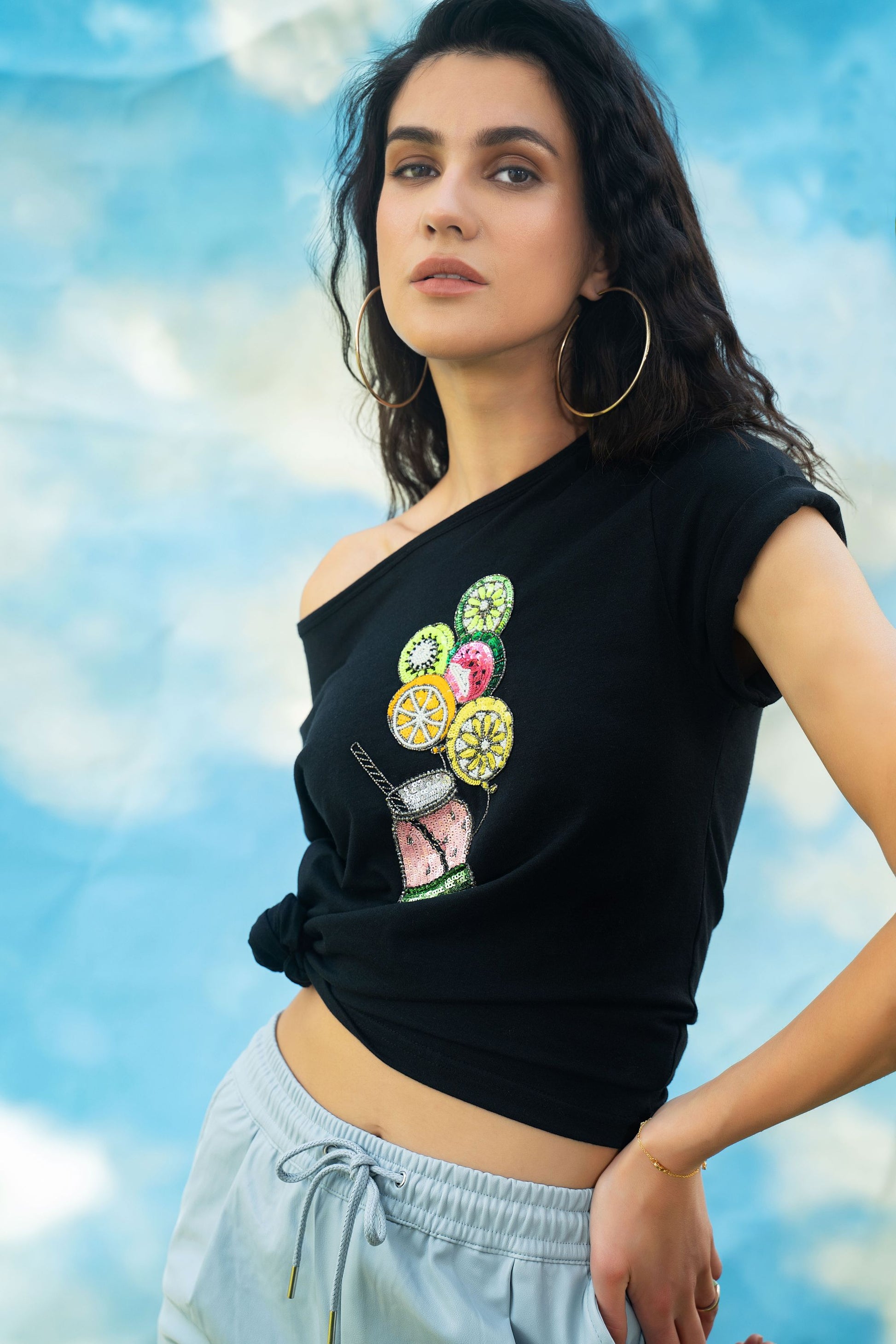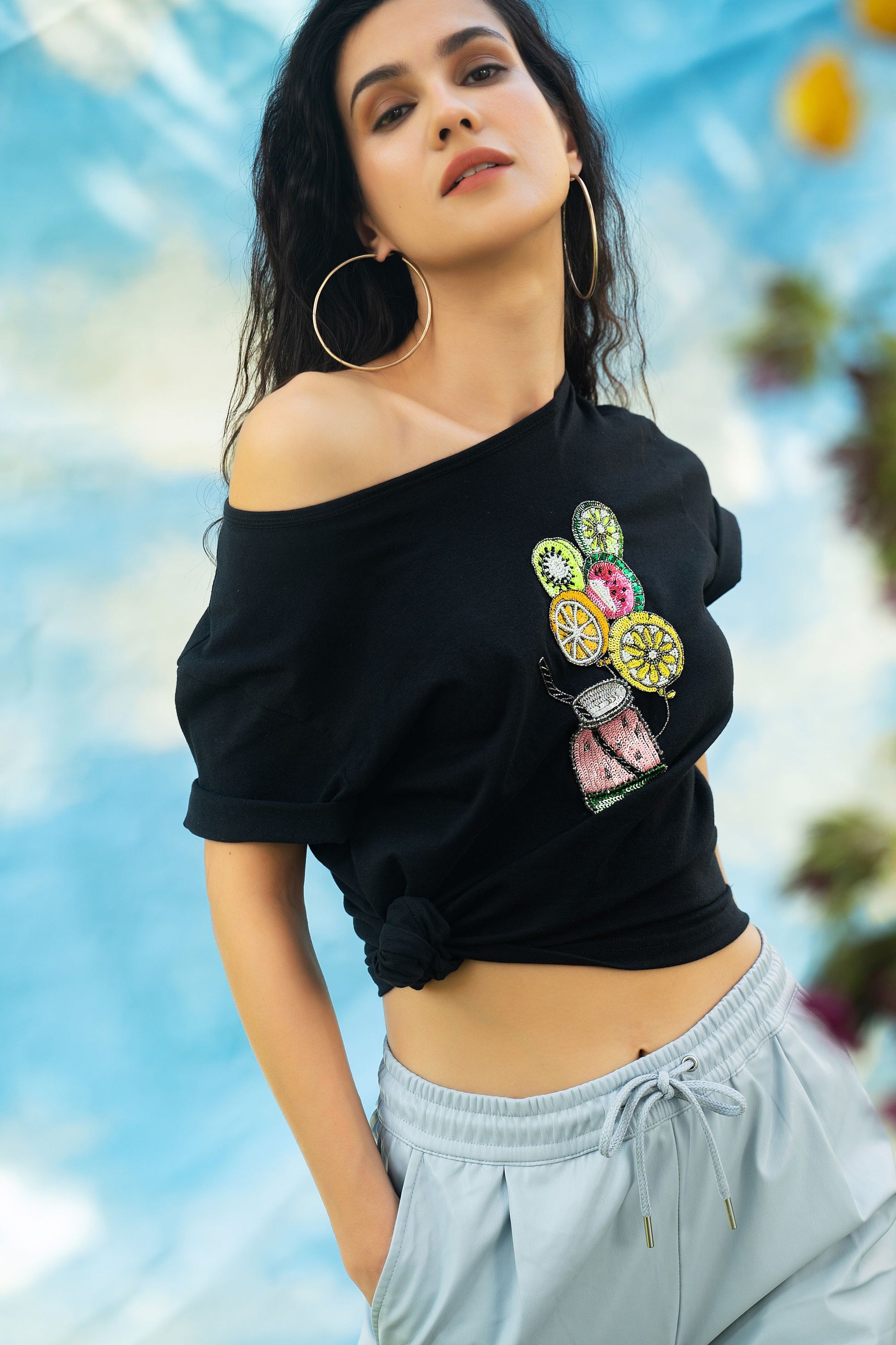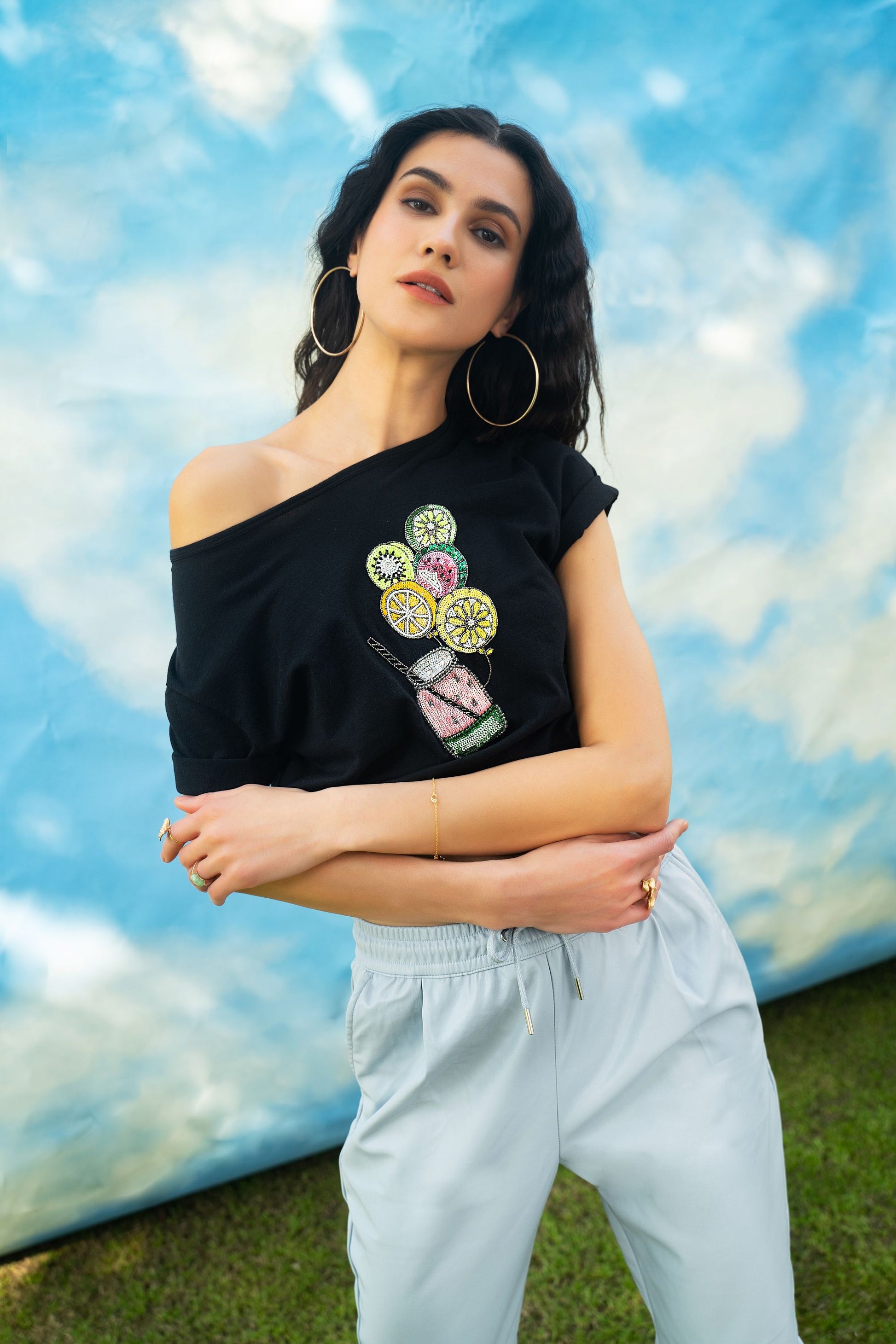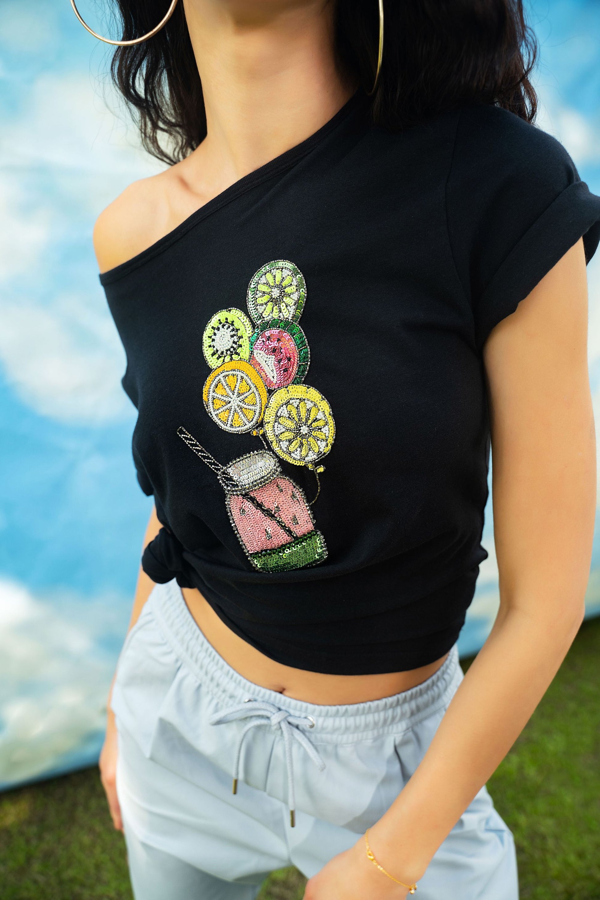 BOYFRIEND FIT ORGANIC COTTON TSHIRT, HAND EMBROIDERED WITH SEQUINS AND SWAROVSKI.