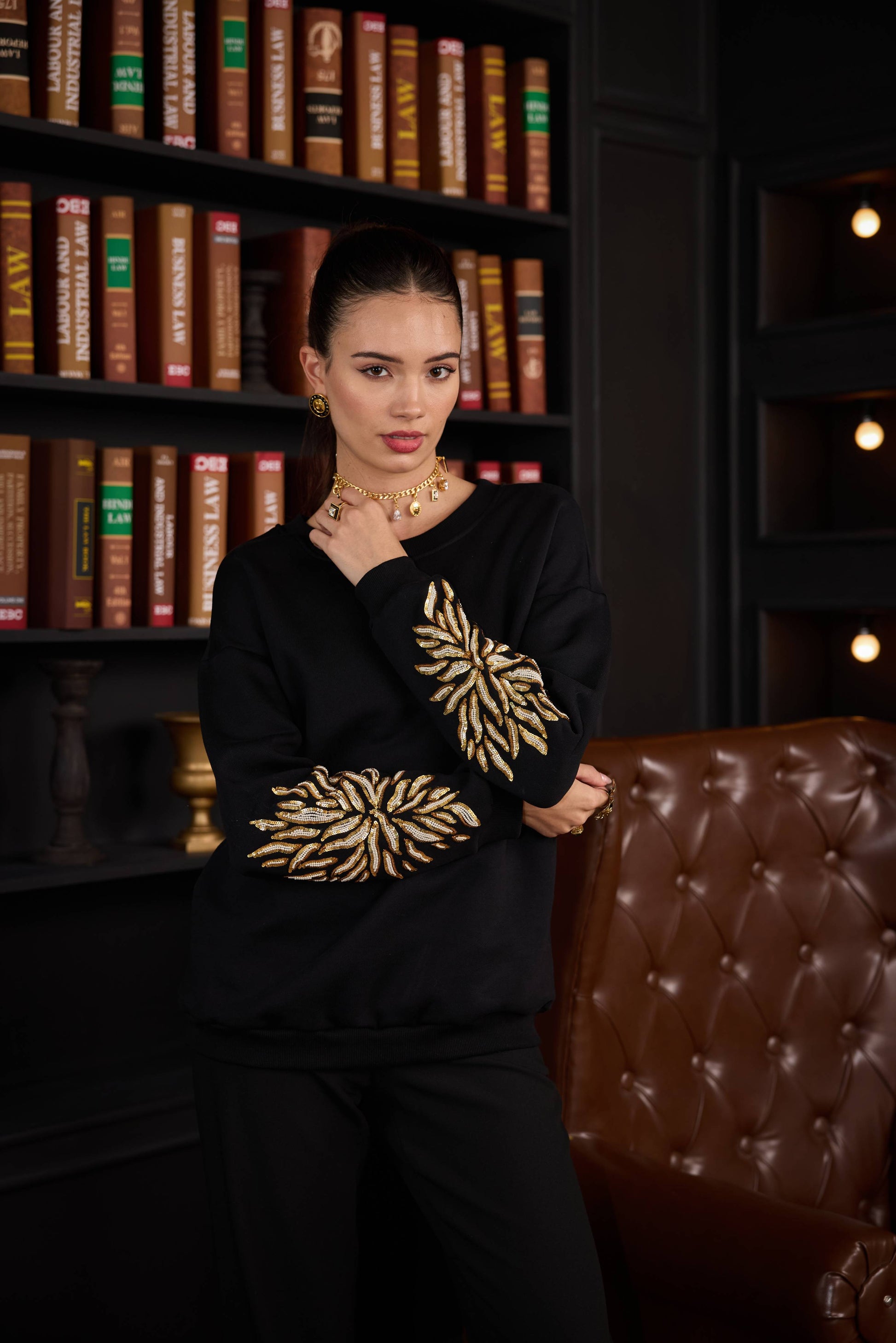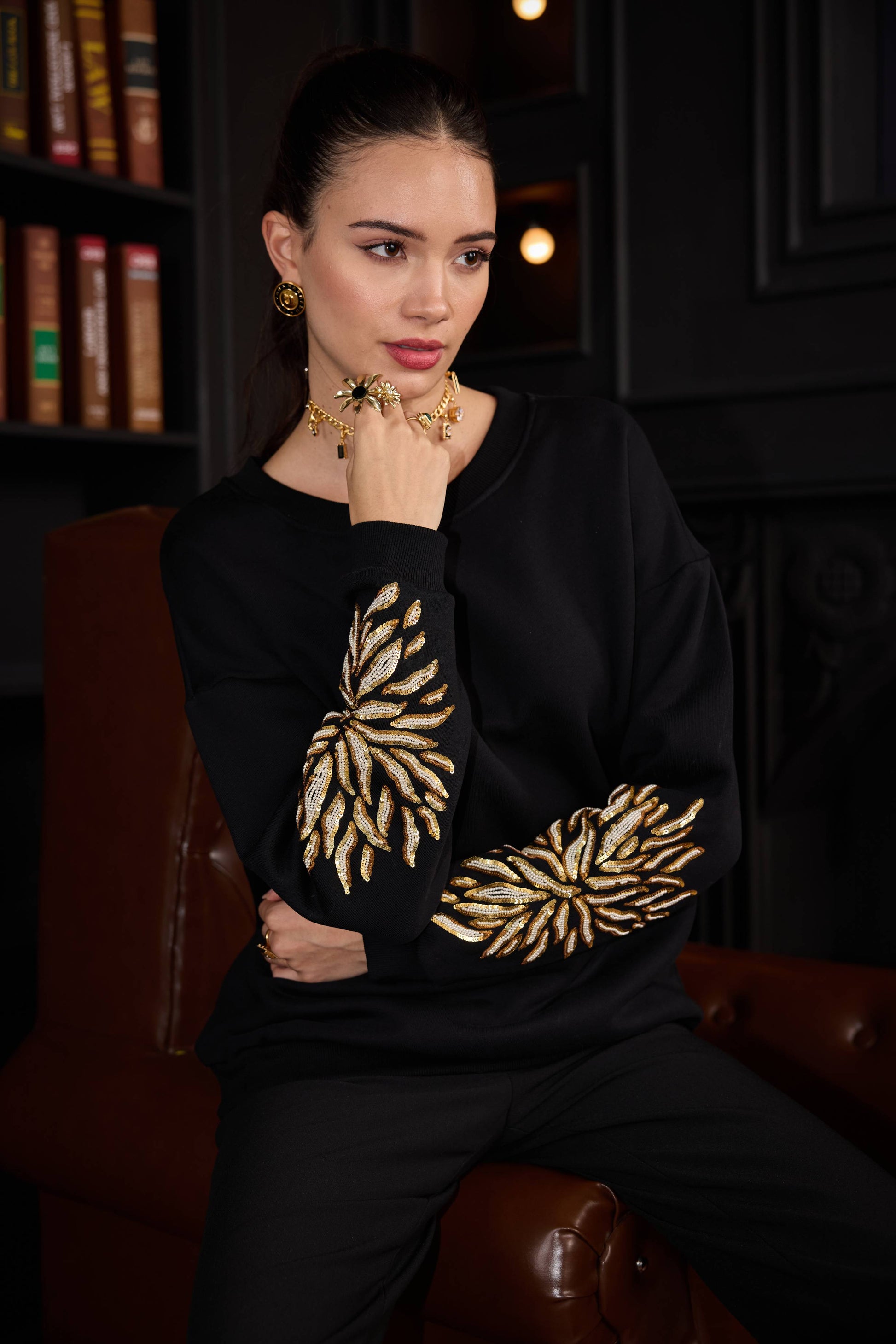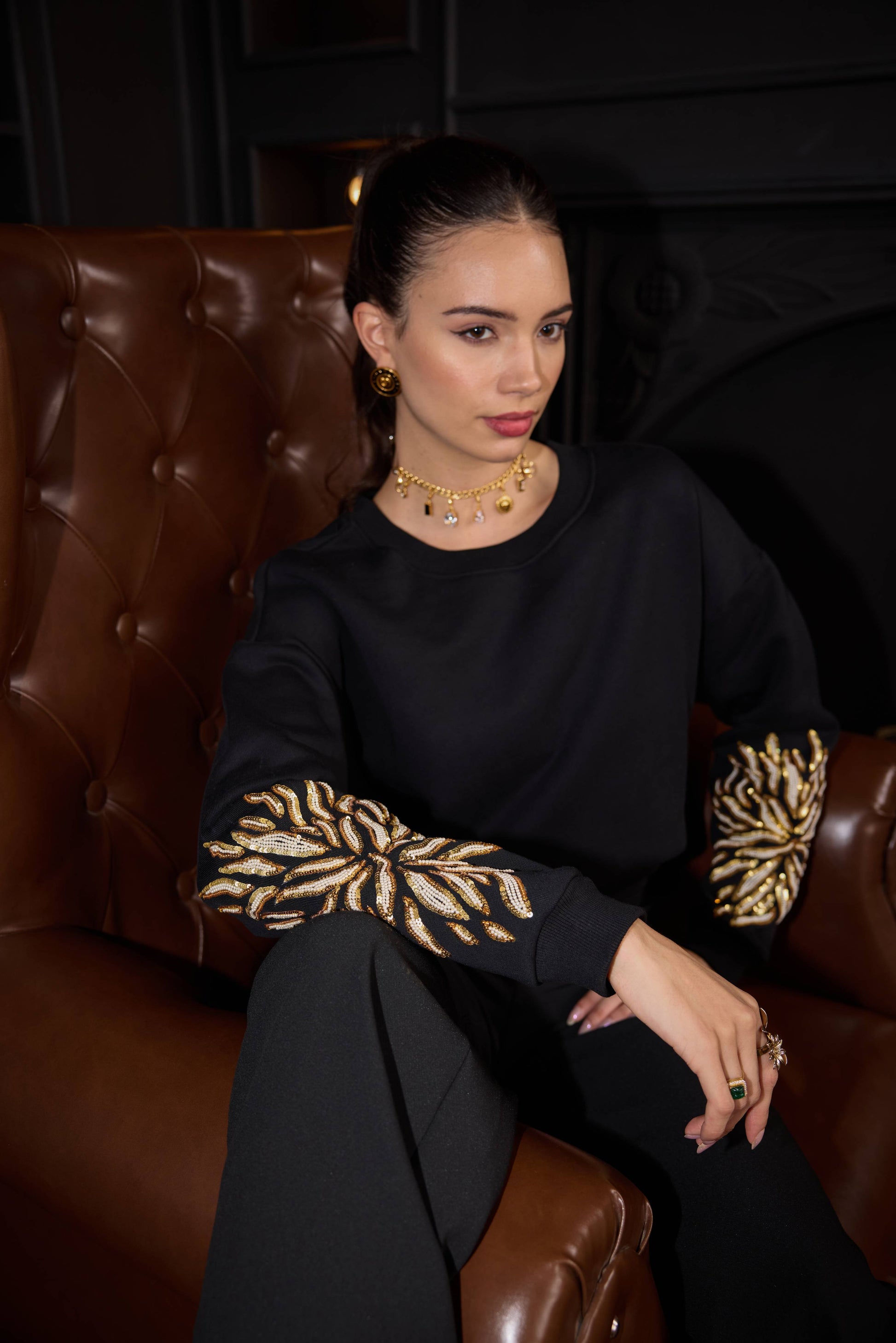 Fleece Sweatshirt hand embroidered with Swarovski & Stones making beautiful cracker motifs on sleeves.