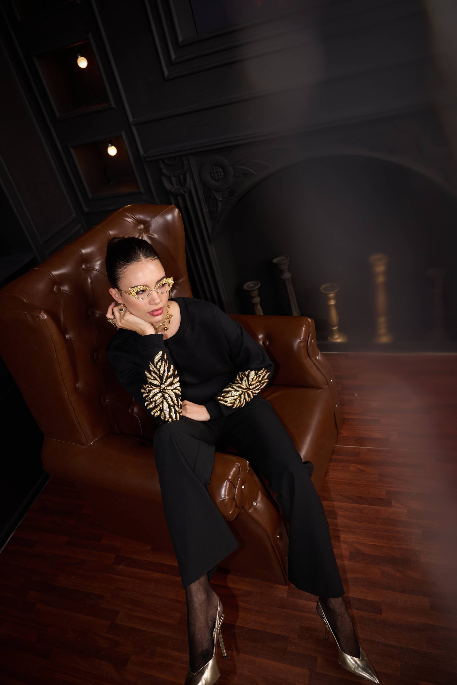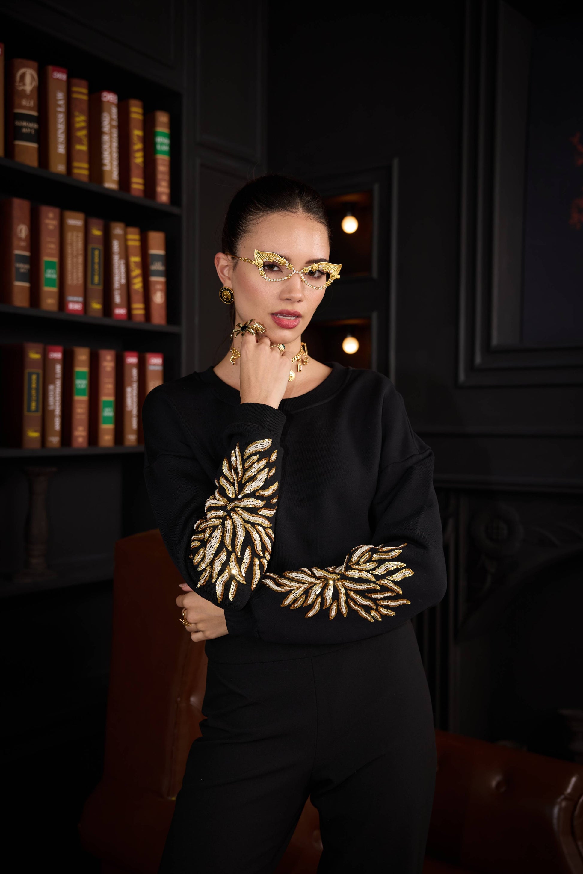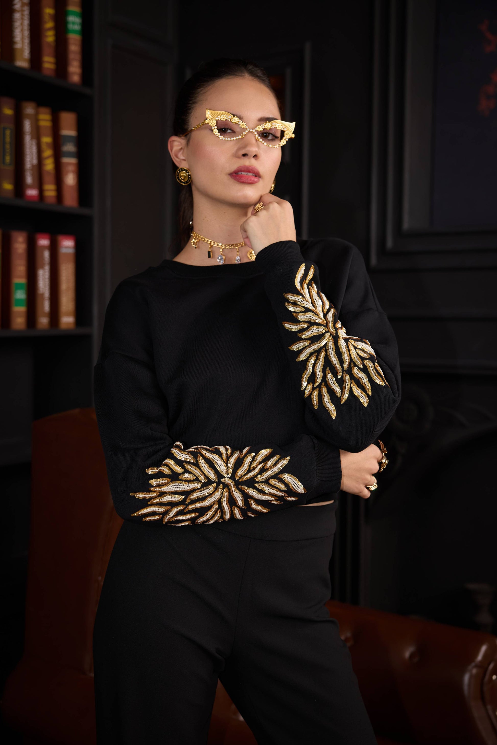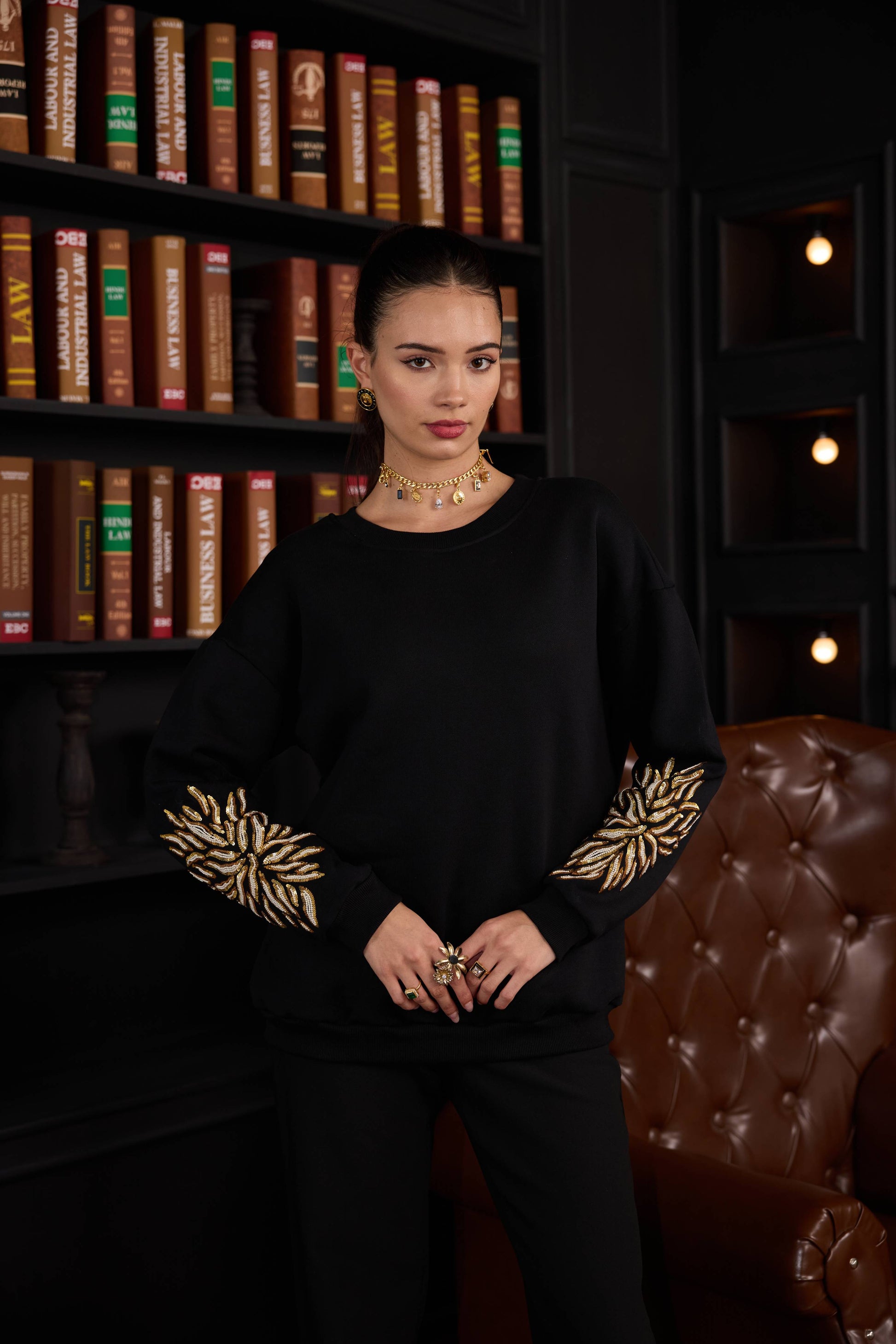 Fleece Sweatshirt hand embroidered with Swarovski & Stones making beautiful cracker motifs on sleeves.
