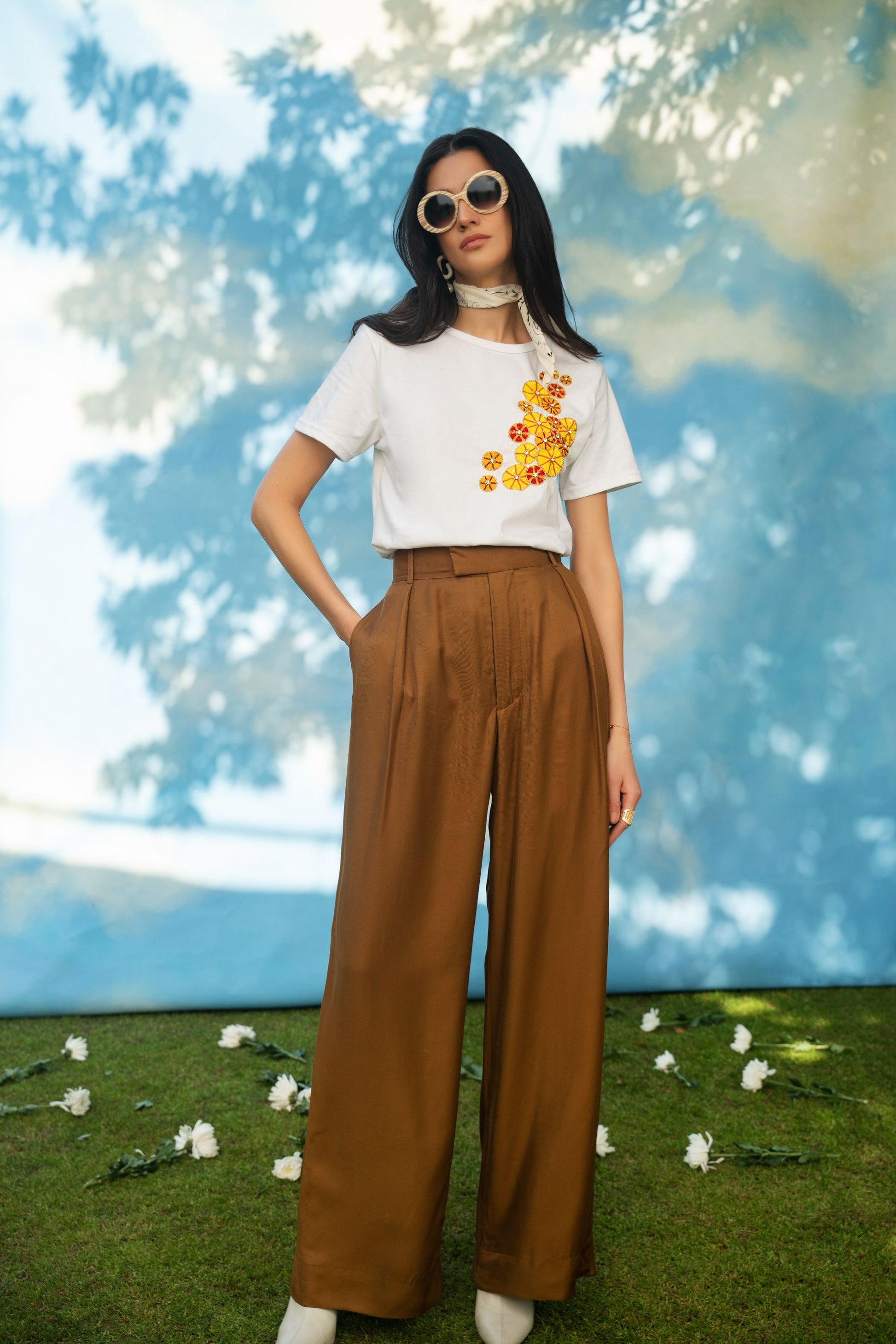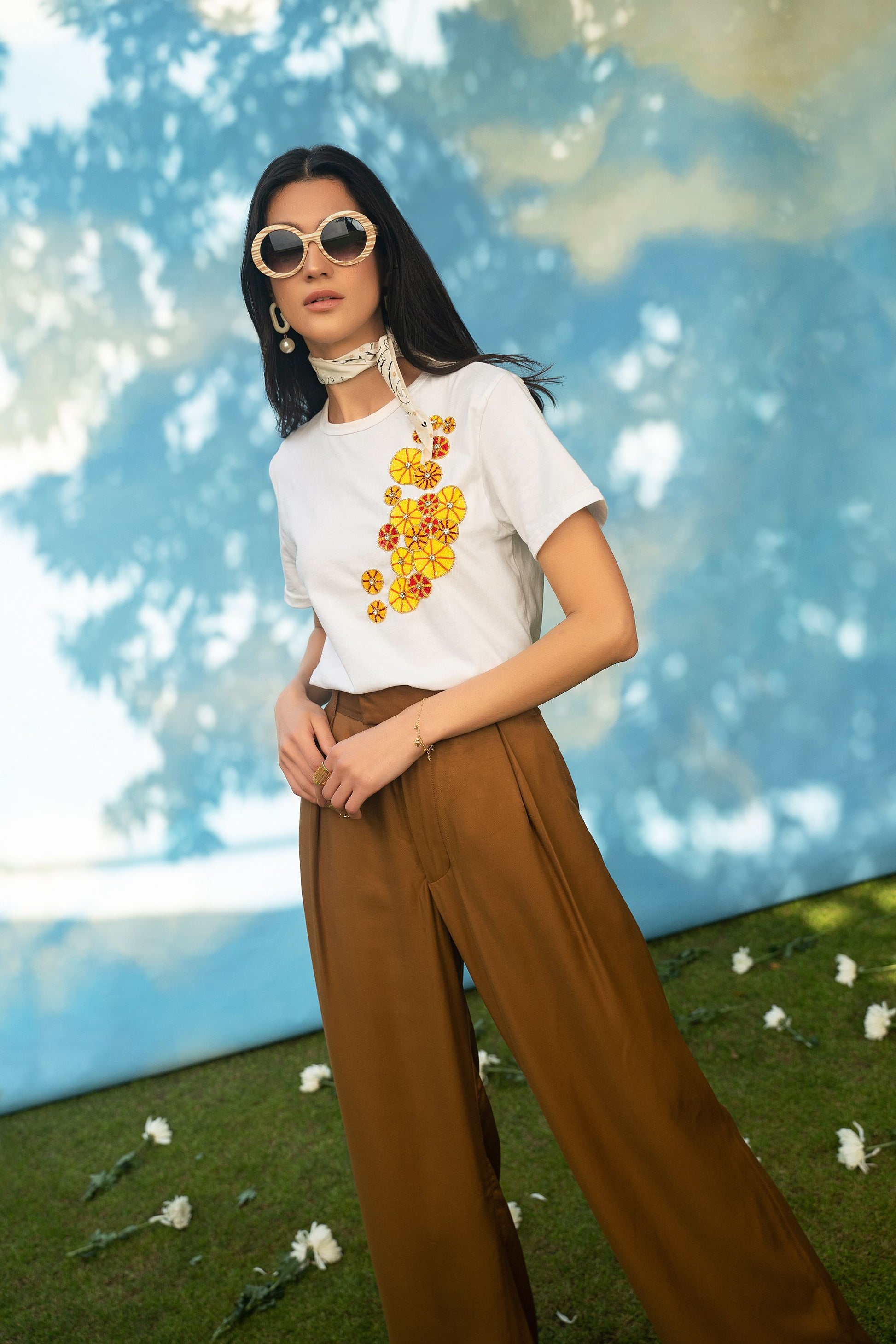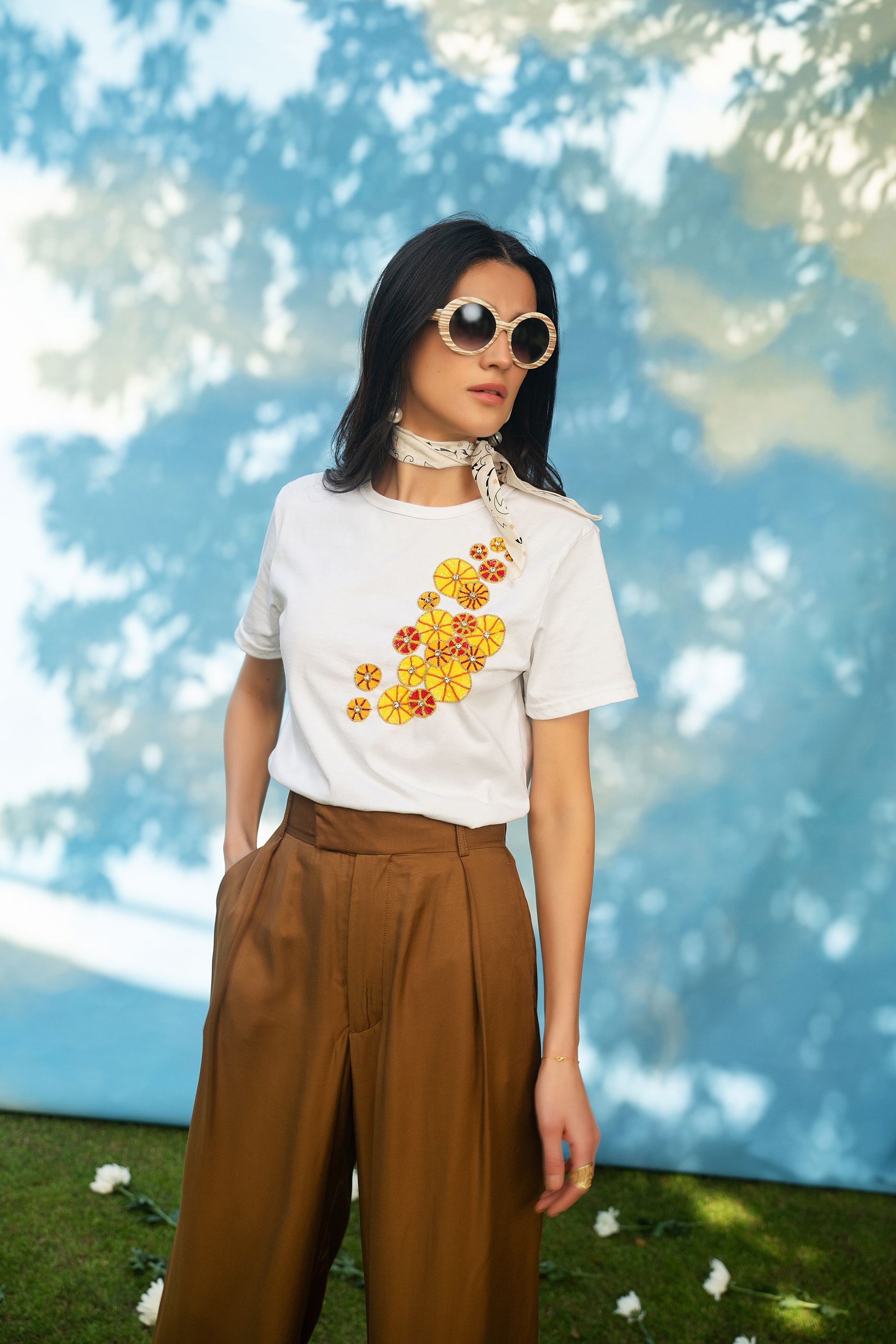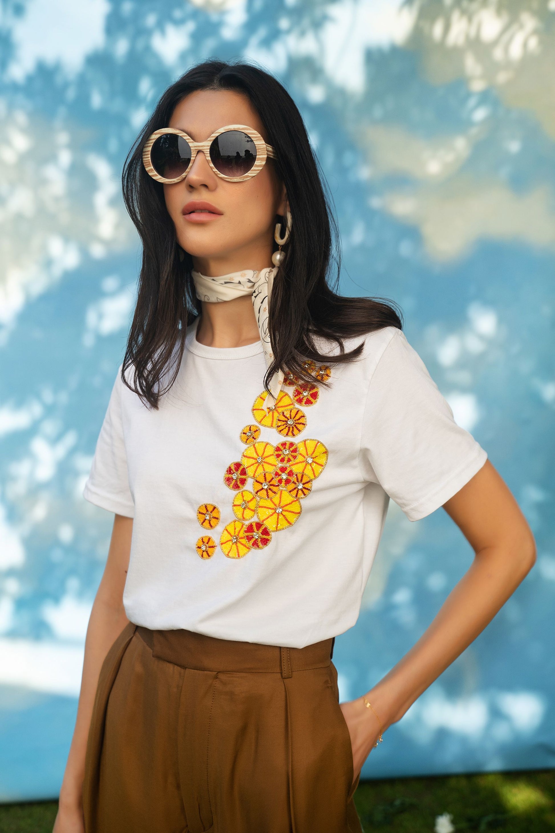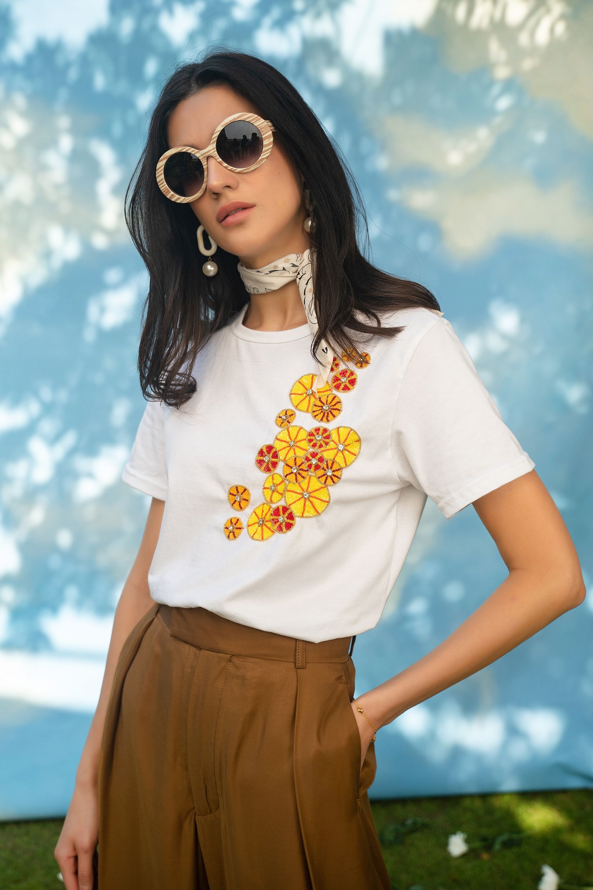 BOYFRIEND FIT ORGANIC COTTON T- SHIRT, HAND EMBROIDERED WITH SEQUINS AND SWAROVSKI.