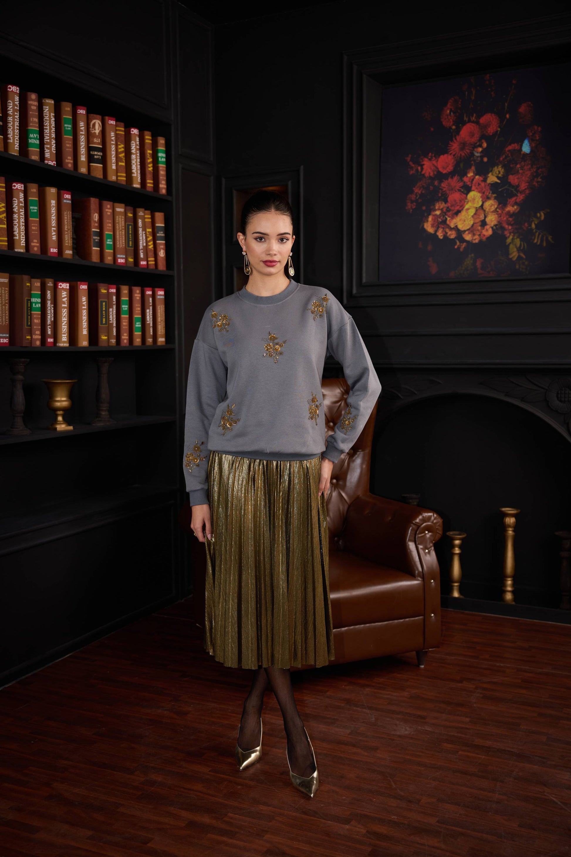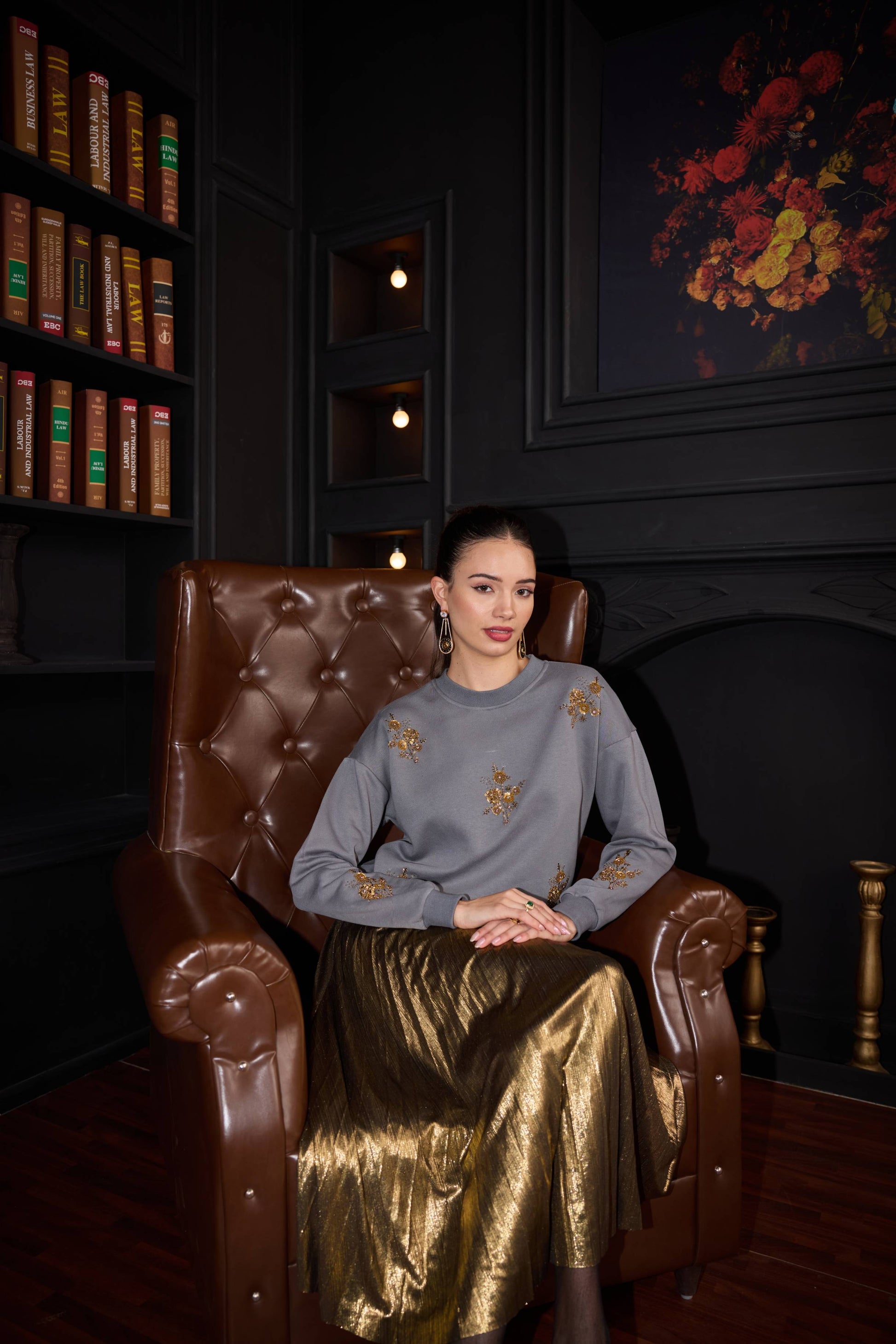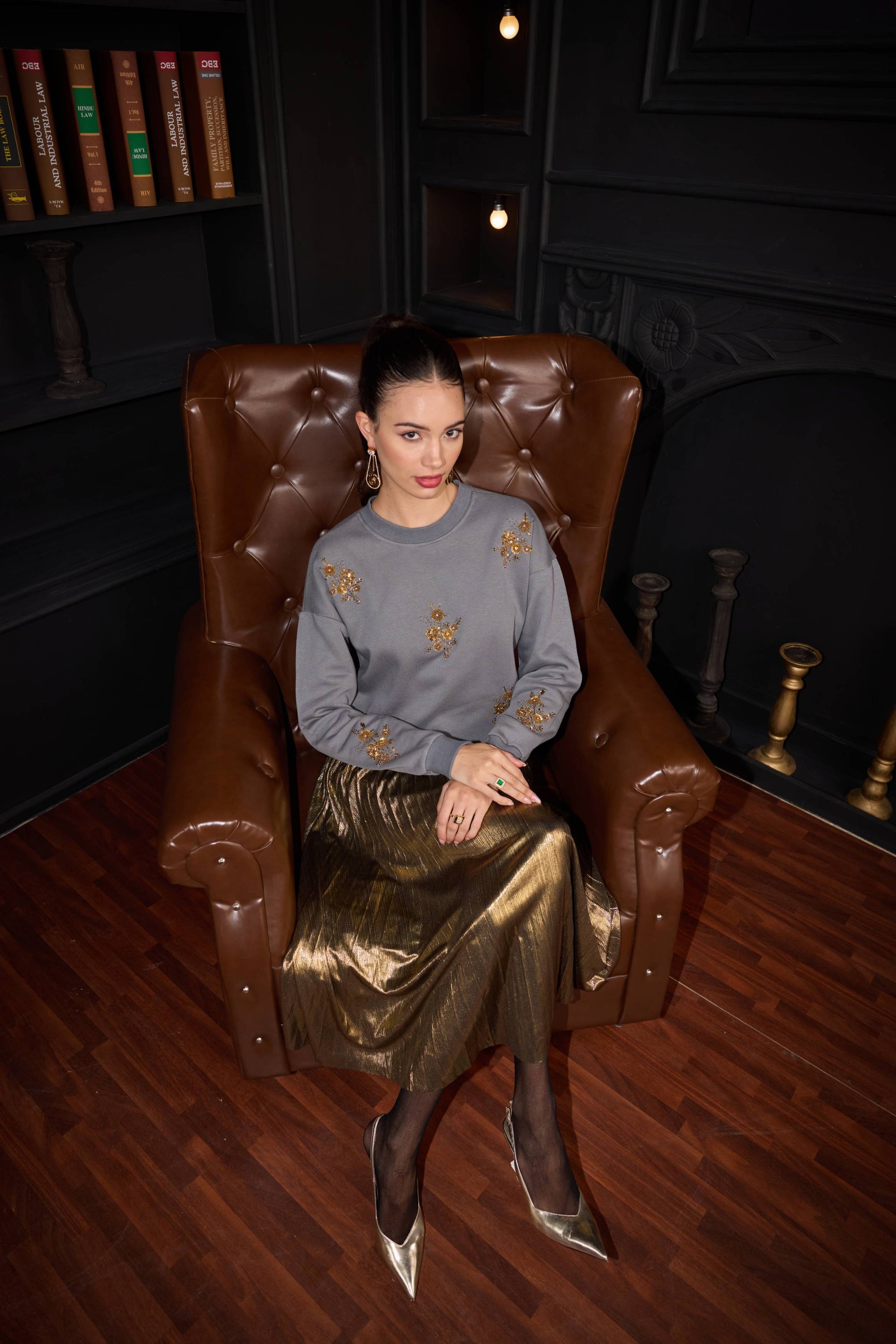 Fleece Sweatshirt hand embroidered with Swarovski & Stones making a beautiful flower motifs all over the sweatshirt.