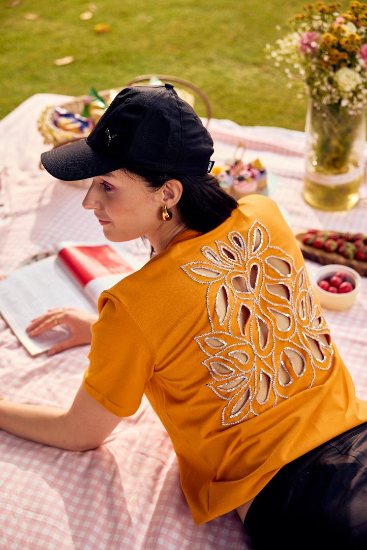 Organic cotton t-shirt, hand embroidered with Swarovskis & sequins and detailed with cutwork