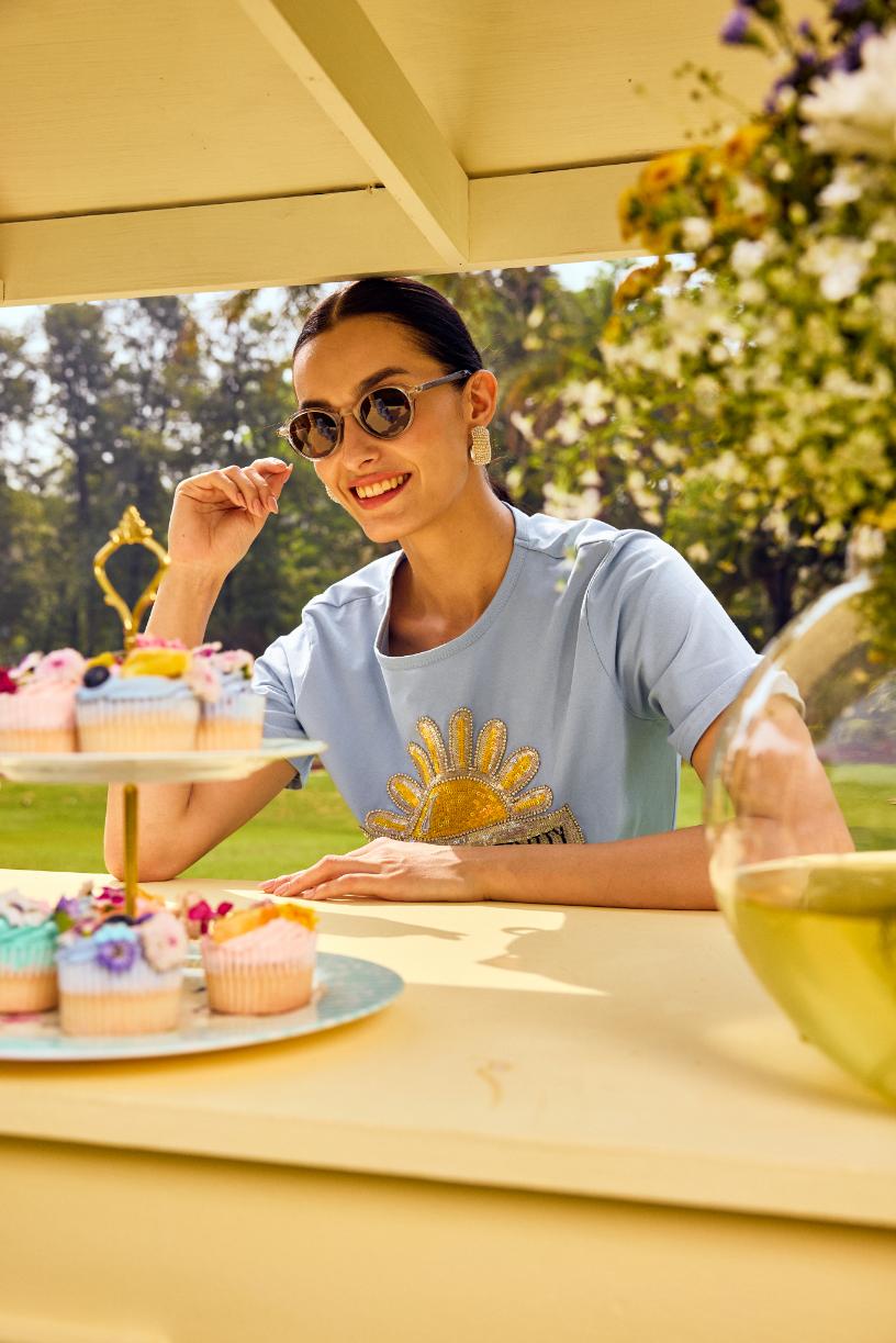 Organic cotton t-shirt, hand embroidered with Swarovskis & sequins.