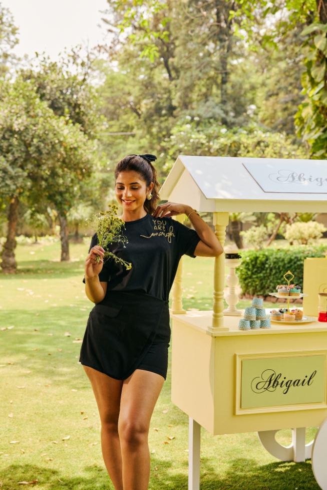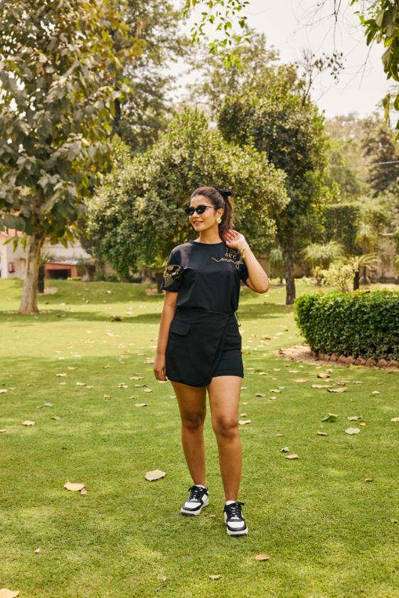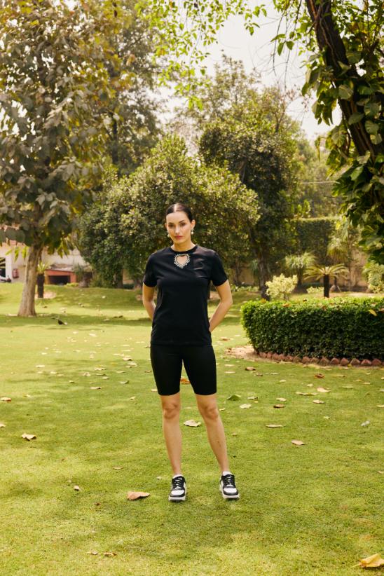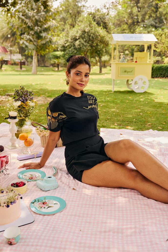 Organic cotton t-shirt, hand embroidered with Swarovskis & sequins on both the sides.